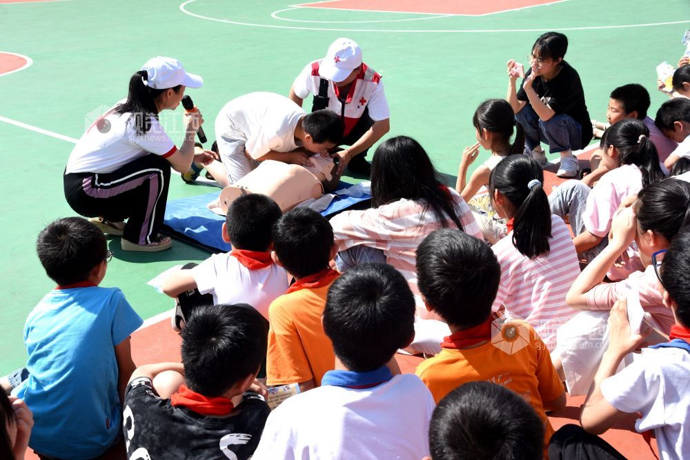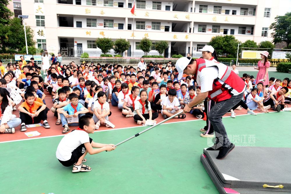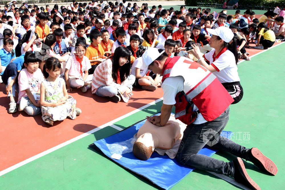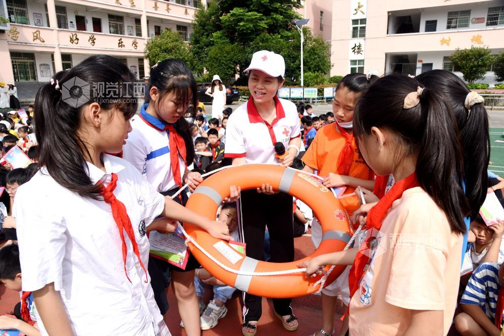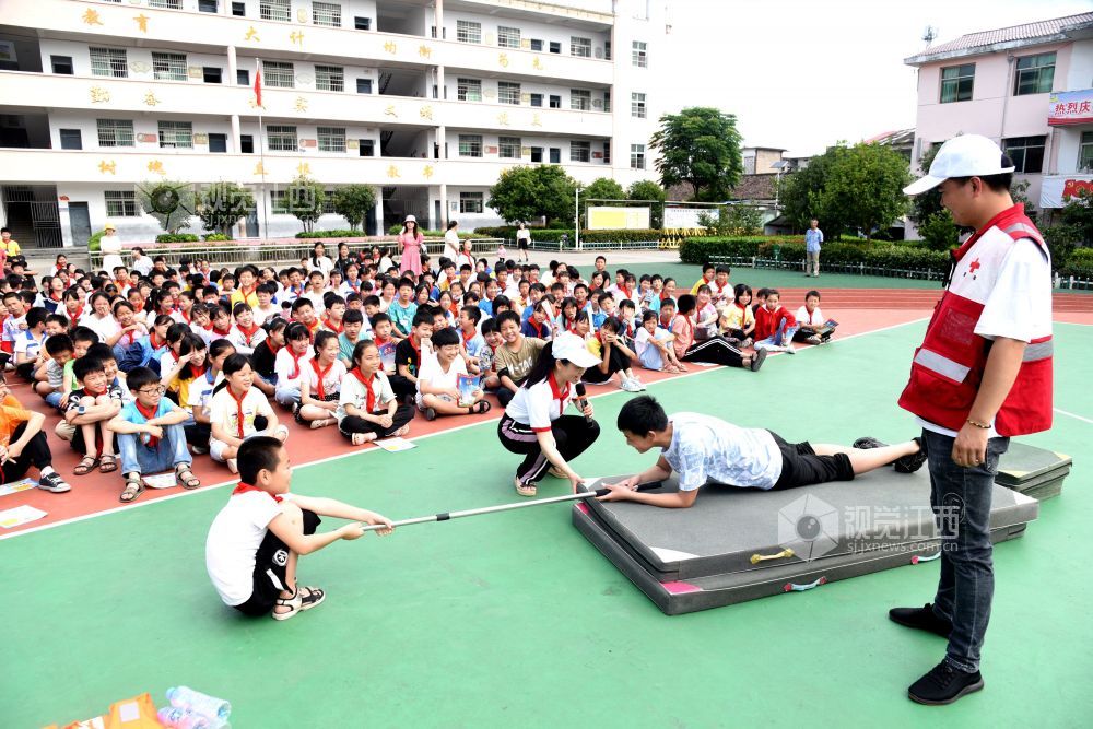 2021年6月10日,在江西省抚州市南丰县白舍镇中心小学操场上,县红十字会的工作人员正在向该校五年级、六年级500多名学生传授防溺水知识,做到警钟长鸣。
