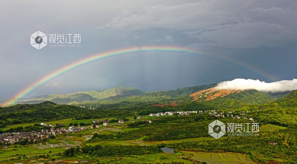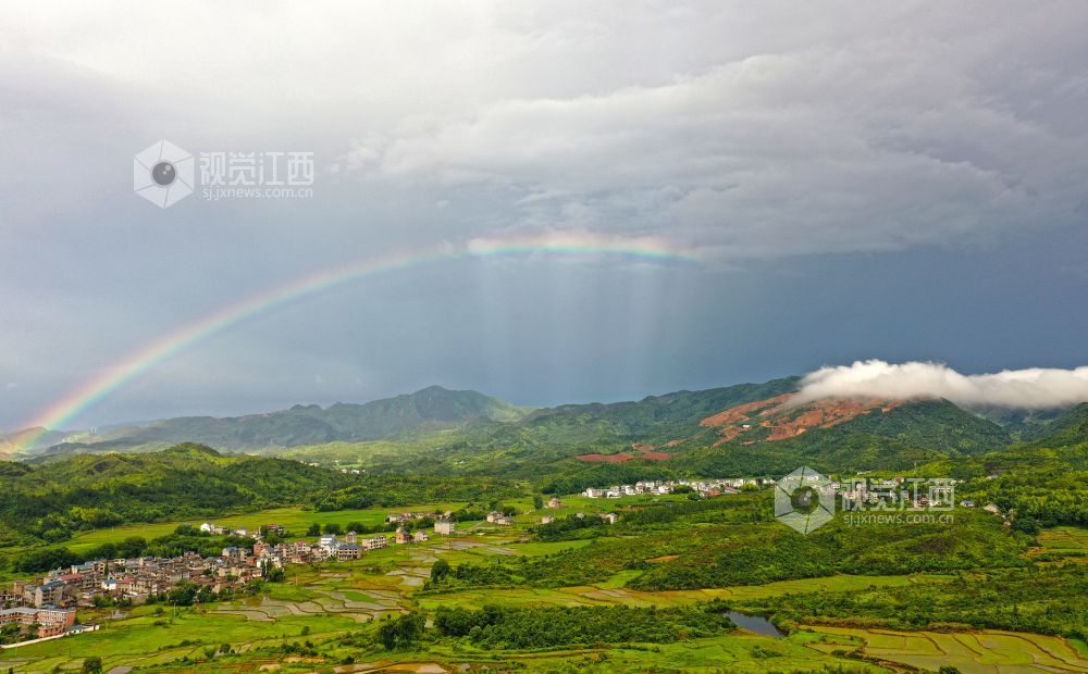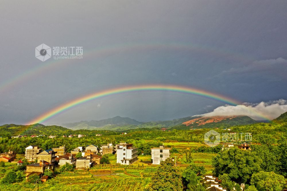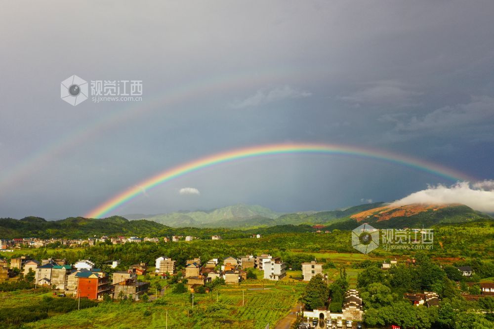 6月12日,航拍江西省上饶市铅山县鹅湖镇上空,大雨过后两道彩虹挂在空中。当天下午,一阵强降雨过后,铅山县上空出现彩虹美景,在彩虹的映衬下,山间田野和城市美不胜收。