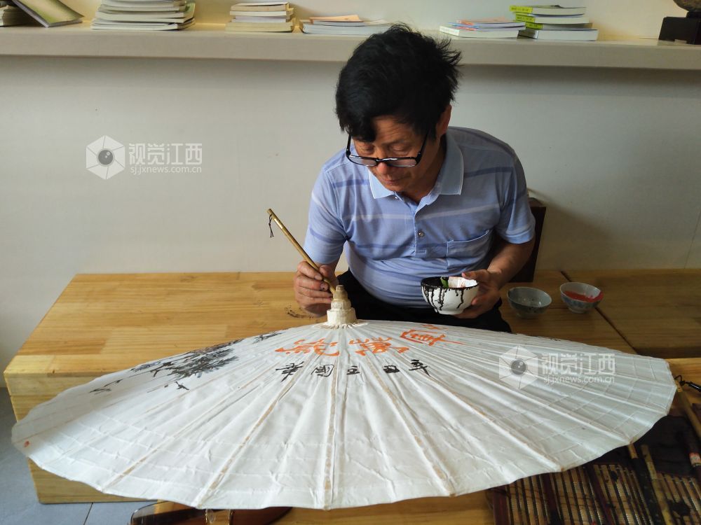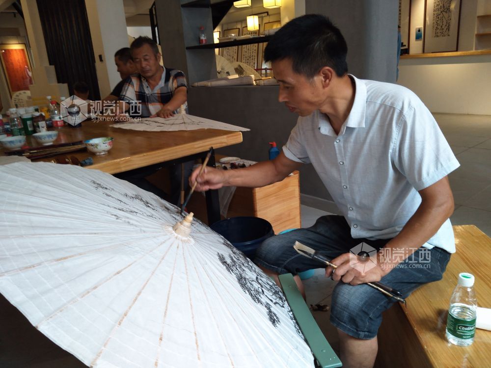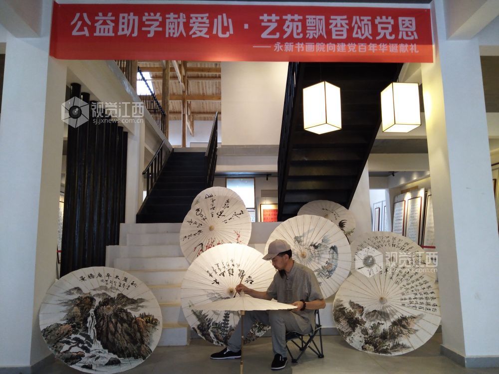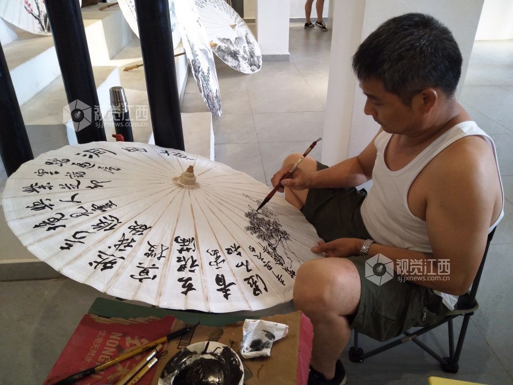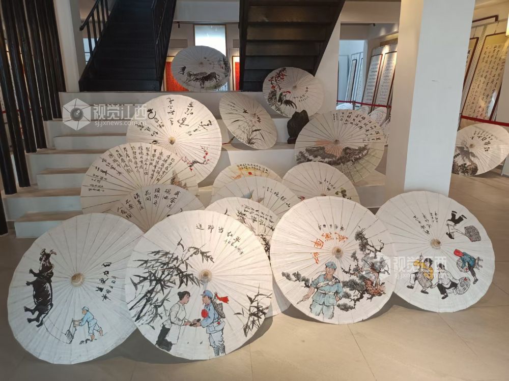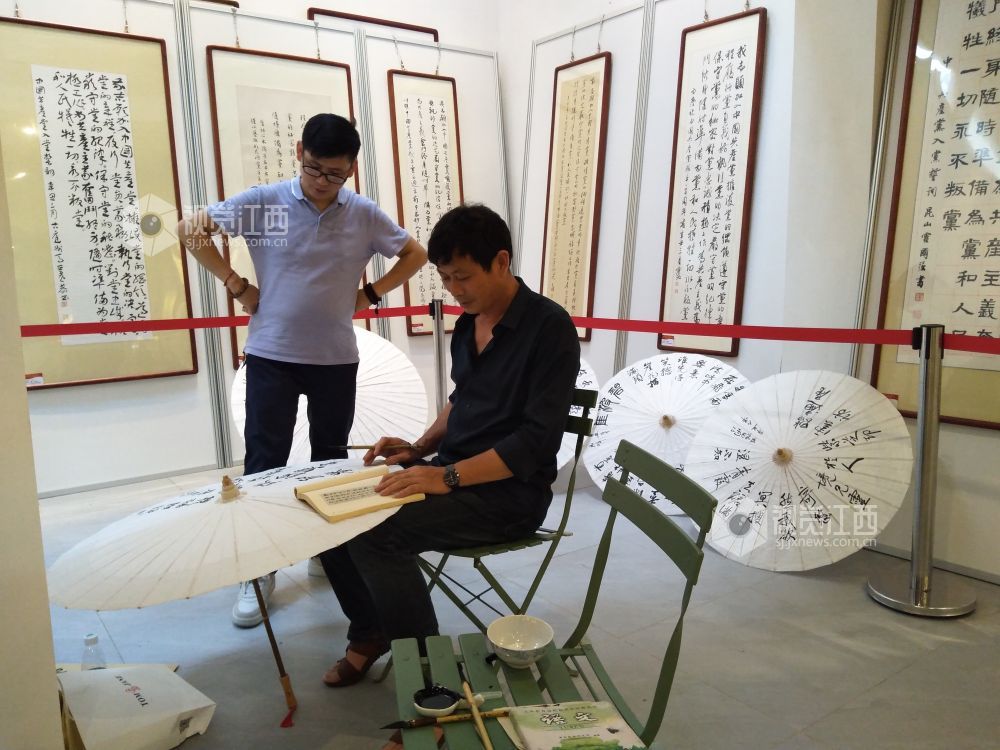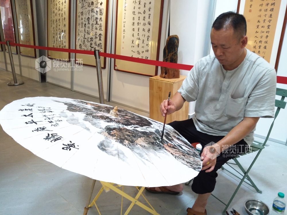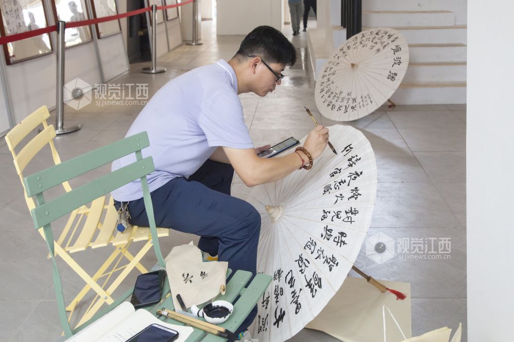 在活动现场,永新的本土书法家们在油纸伞上进行创作,创作的内容有红色景点、书法、花鸟等。书法家们将传统文化与书画作品完美结合,打造出极具特色的文化收藏产品。