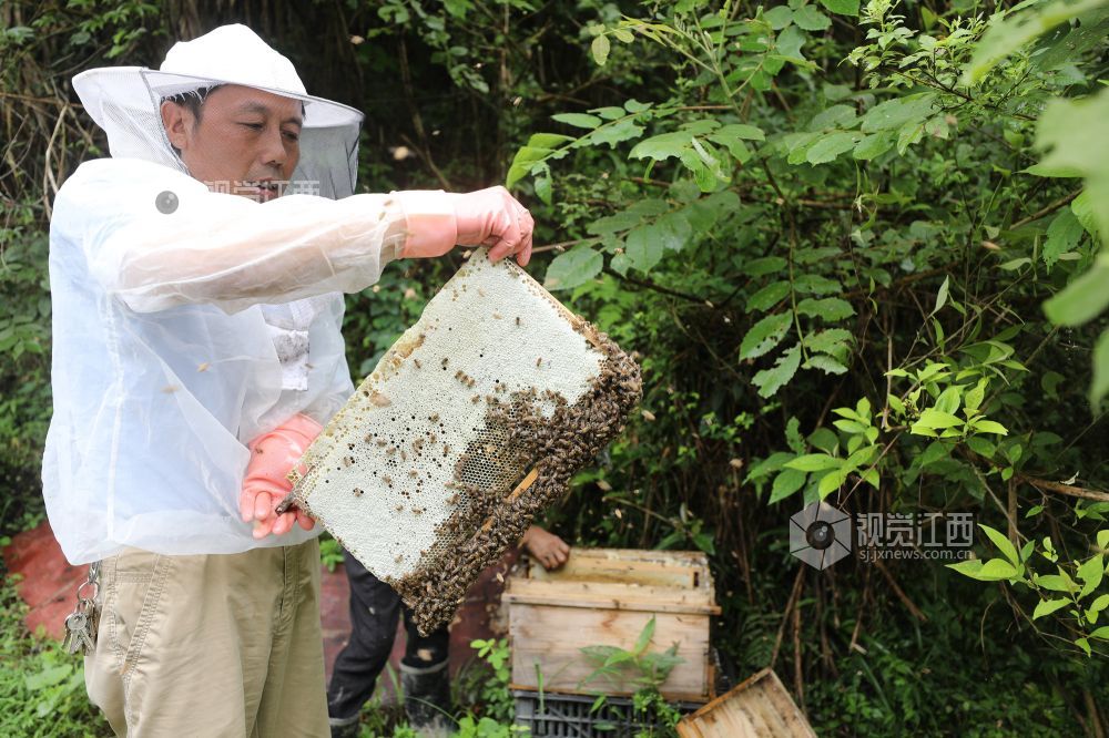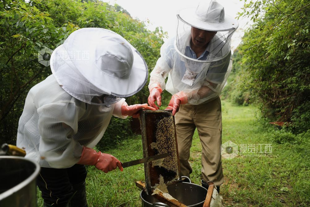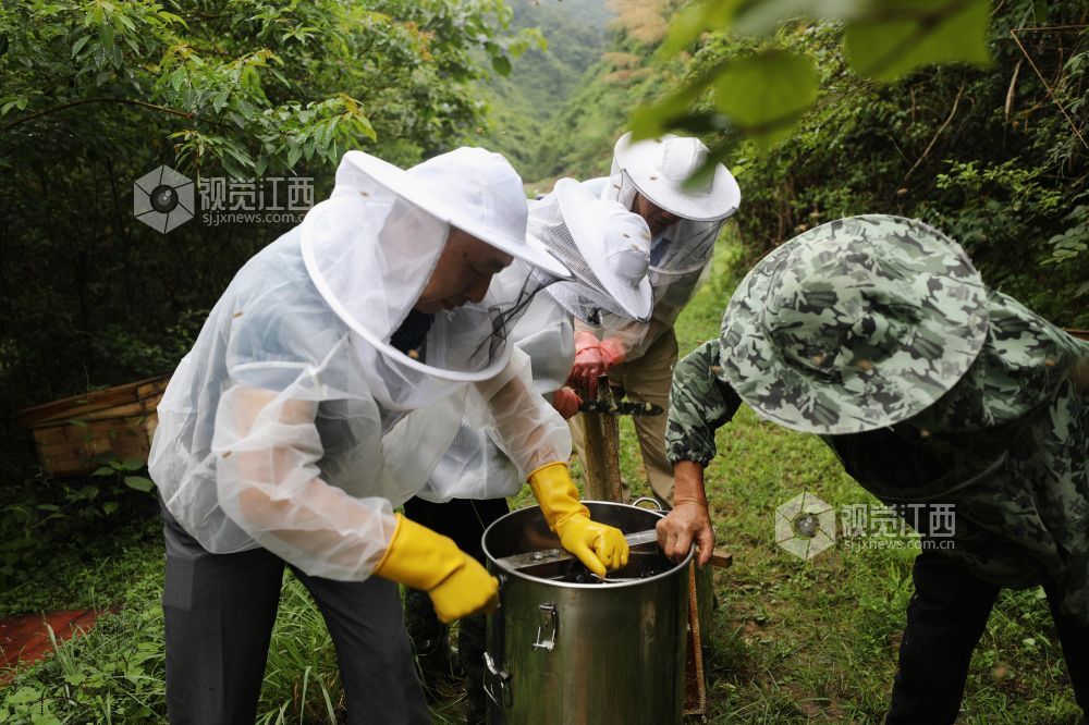 6月22日,江西省莲花县神泉乡周屋冲村养蜂基地,村干部与驻村扶贫队员正在割蜜,收获甜蜜的果实。
