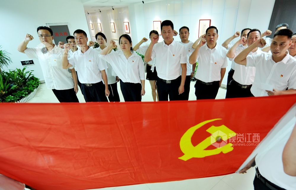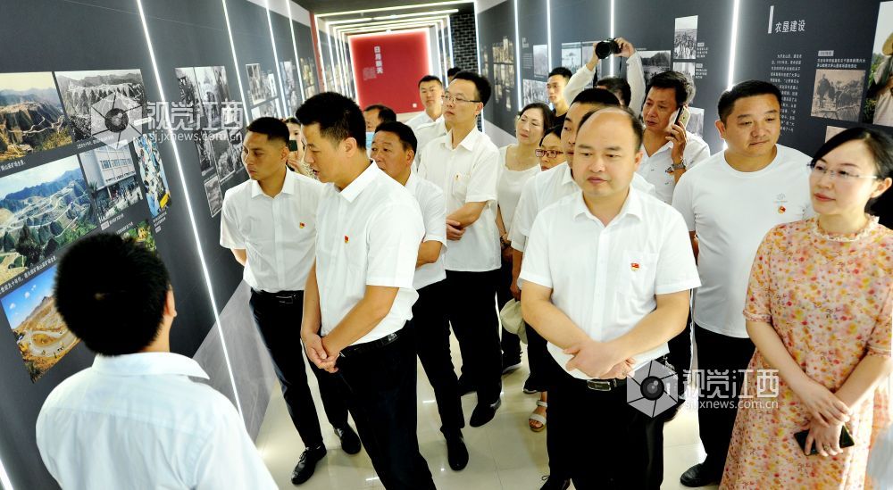 6月24日,江西省德兴市城市管理局党员干部正在观看该市“穿越百年印记,感知百年辉煌”影像展览,接受党史学习教育。