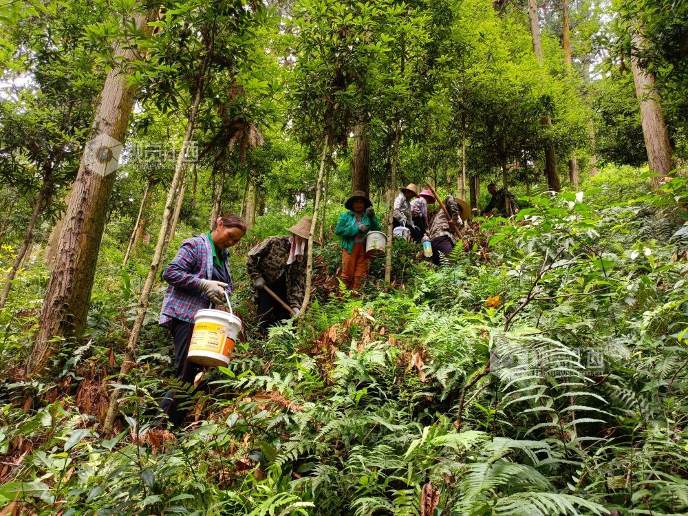 6月27日,江西省安福县明月山林场羊狮慕分场荣溪管护站国储林基地,一群民工正在对树木修剪、施肥,全力以赴投入到夏季中幼林抚育。