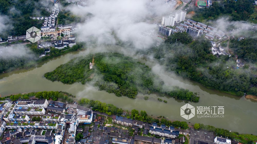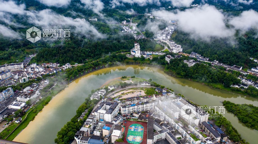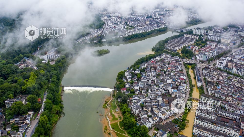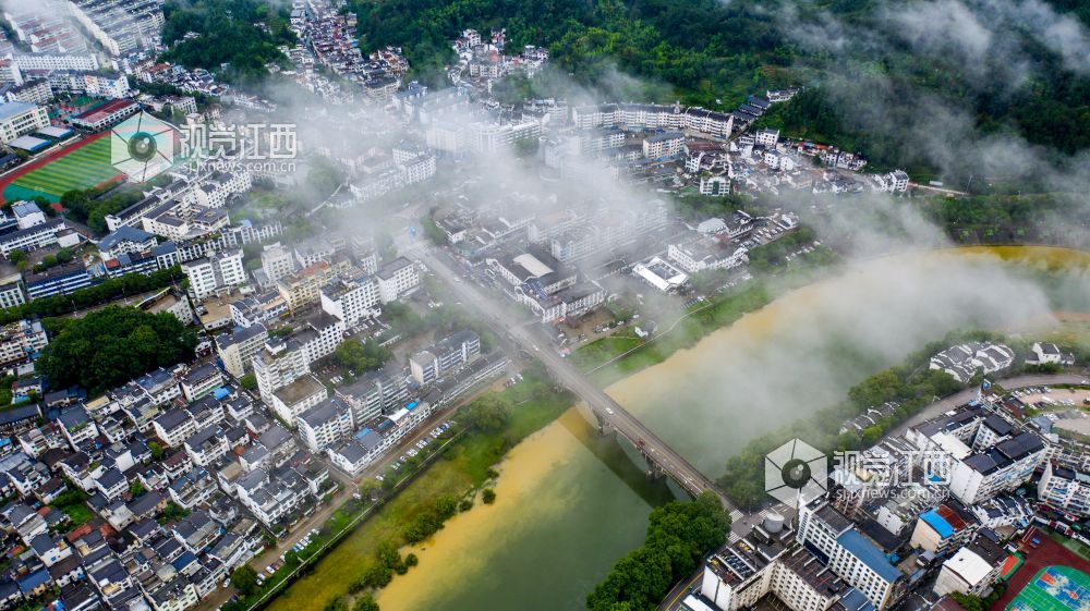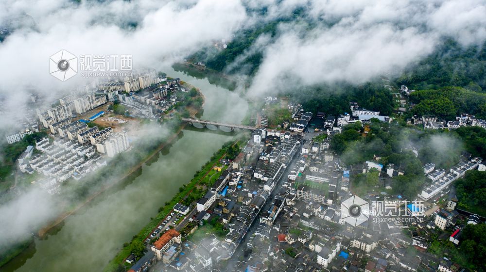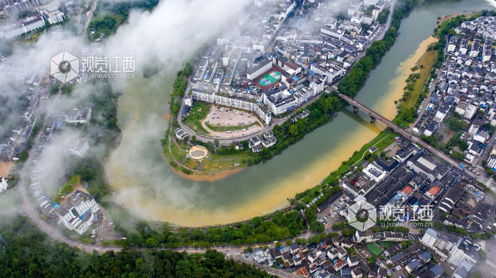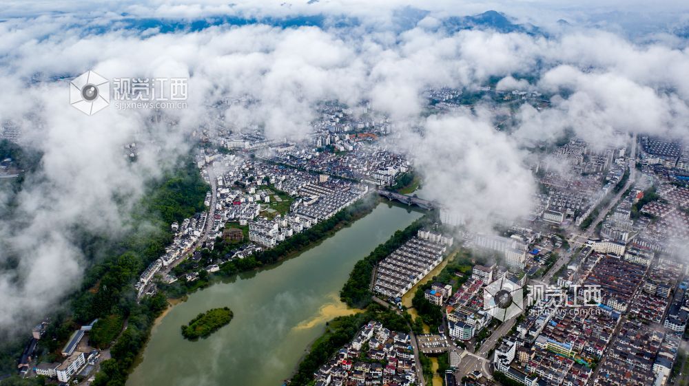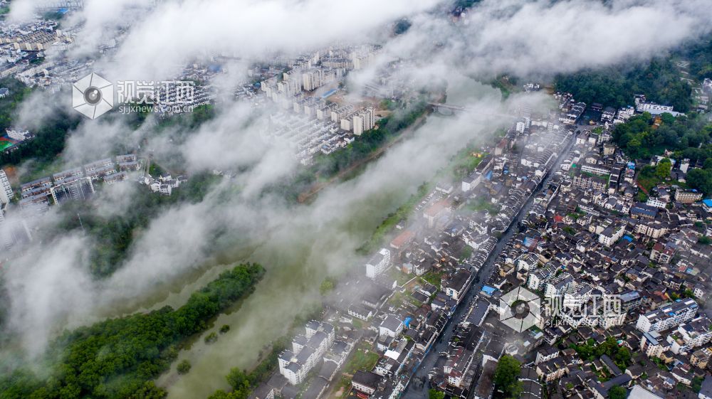 2021年6月28日,江西省上饶市婺源,大雨过后云雾缭绕,从空中俯瞰县城宛若仙境。