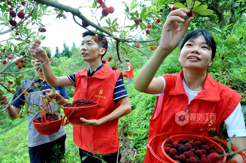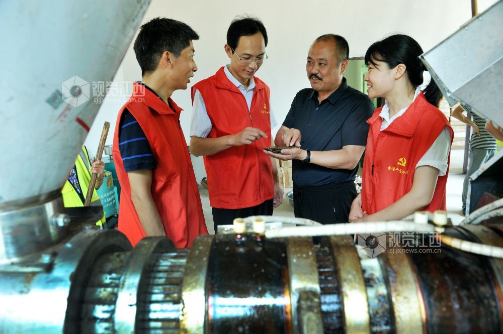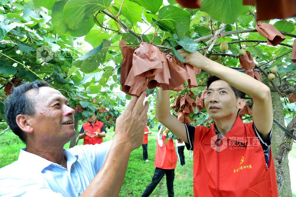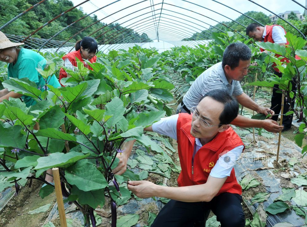 6月17日,江西省德兴市泗洲镇党员干部来到田间地头现场帮助菜农做好茄子的田间管理工作。