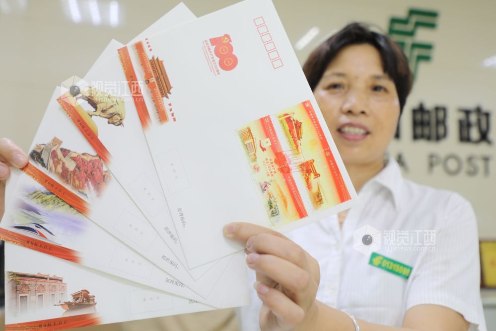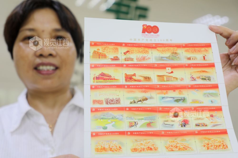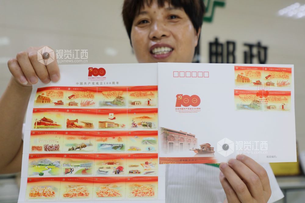 2021年7月1日,在中国邮政集团公司江西省吉安市峡江县分公司,工作人员在展示《中国共产党成立100周年》纪念邮票和纪念封。当日,中国邮政发行《中国共产党成立100周年》纪念邮票1套20枚,纪念封1套1枚。整套纪念邮票回顾历史、展现成就、憧憬未来,充分展现了中国共产党百年奋斗的光辉历程和辉煌成就。