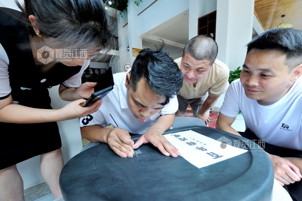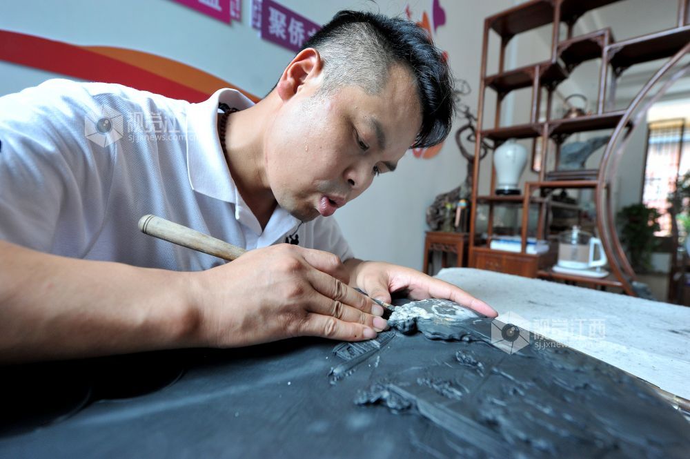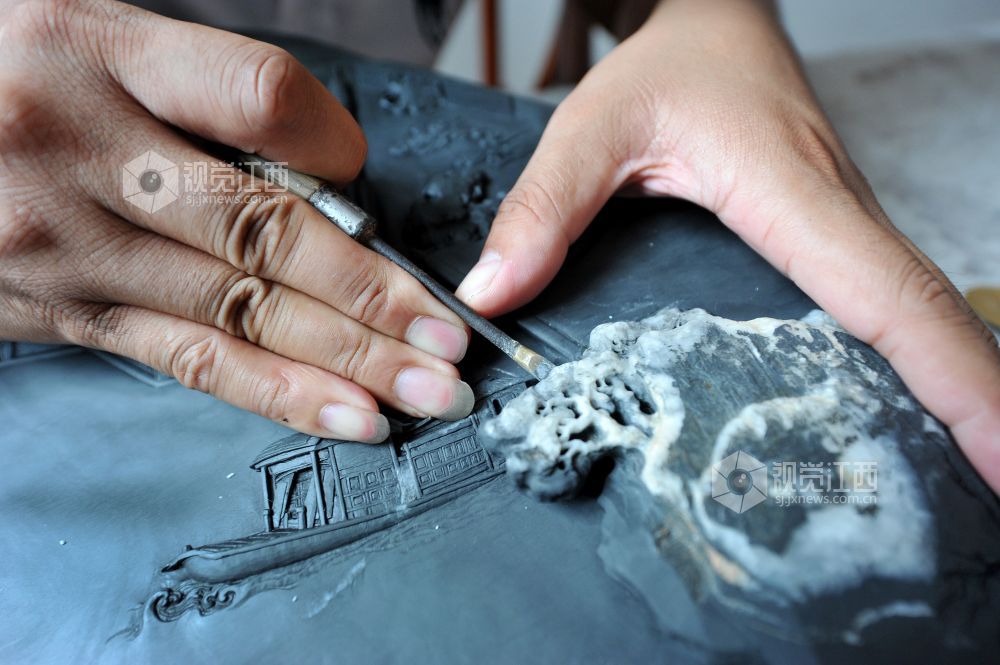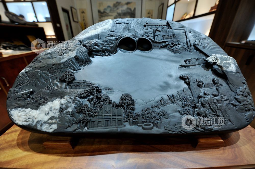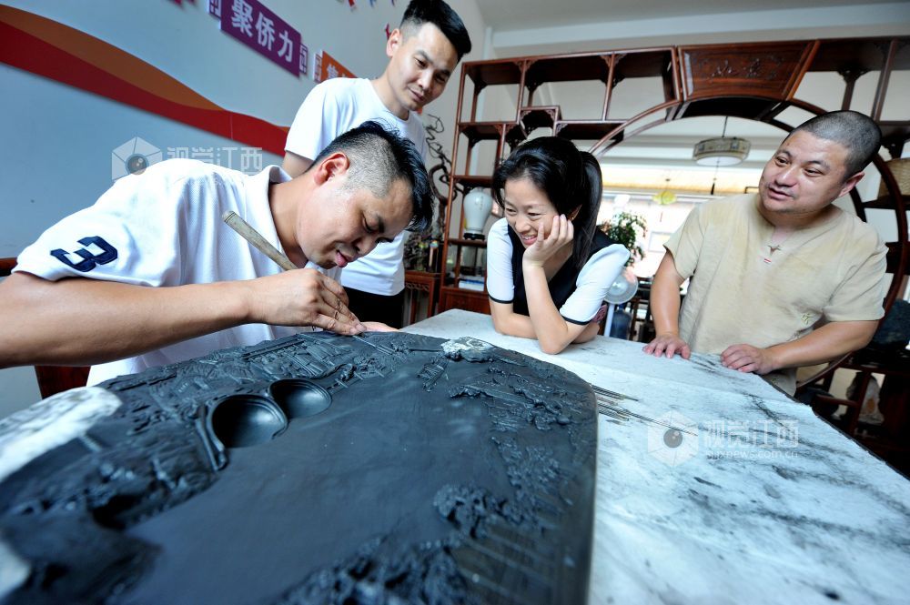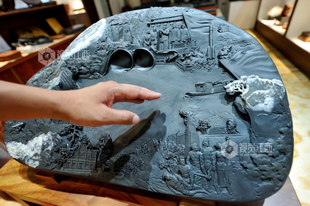 6月27日,江西省上饶市玉山县砚雕师工匠大朱国彬正在给前来该县七里街的砚雕一条街工作室参观的客人介绍刚刚完工的大型砚雕《百年辉煌》作品。