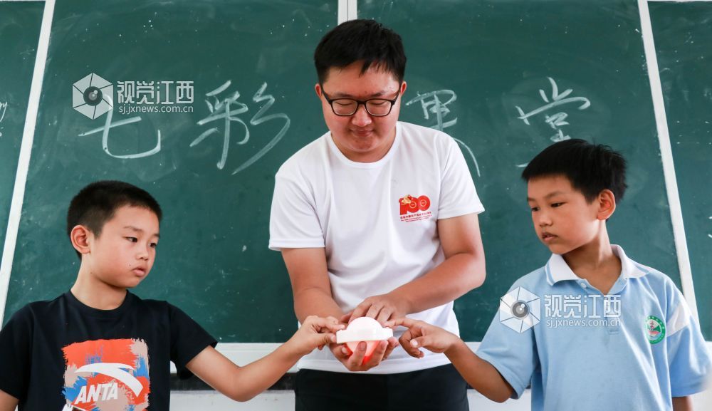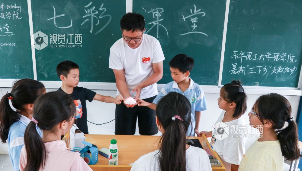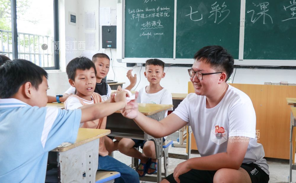 2021年7月2日,东华理工大学理学院“红心向党”三下乡暑期社会实践团走进江西省抚州市金溪县浒湾镇中学开展为期6天的“七彩课堂”志愿支教活动。他们通过上户交流、发放调查问卷等形式,吸纳了周边许多孩子参与活动。奇妙勾人的科普课、生动有趣的素质拓展课、妙趣横生的音乐课......志愿者与学生互动交流,青春热情的老师和丰富多彩的课程温暖了众多乡村儿童。
