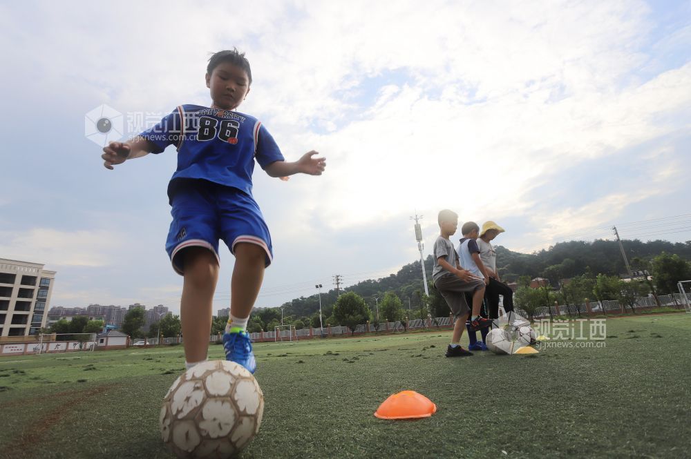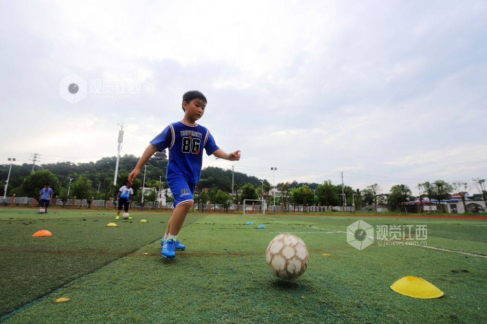 2021年7月4日,江西省吉安市安福县平都镇蒙冈岭社区的孩子们在练足球。