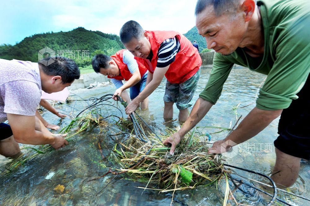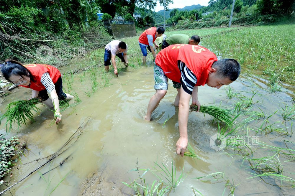 7月4日,江西省德兴市昄大乡党员干部在该镇泸口村帮助村民补栽被山洪冲毁的稻田秧苗。