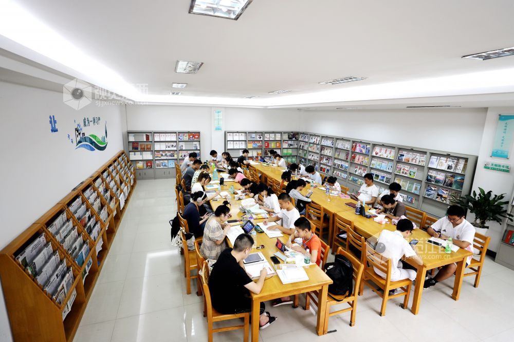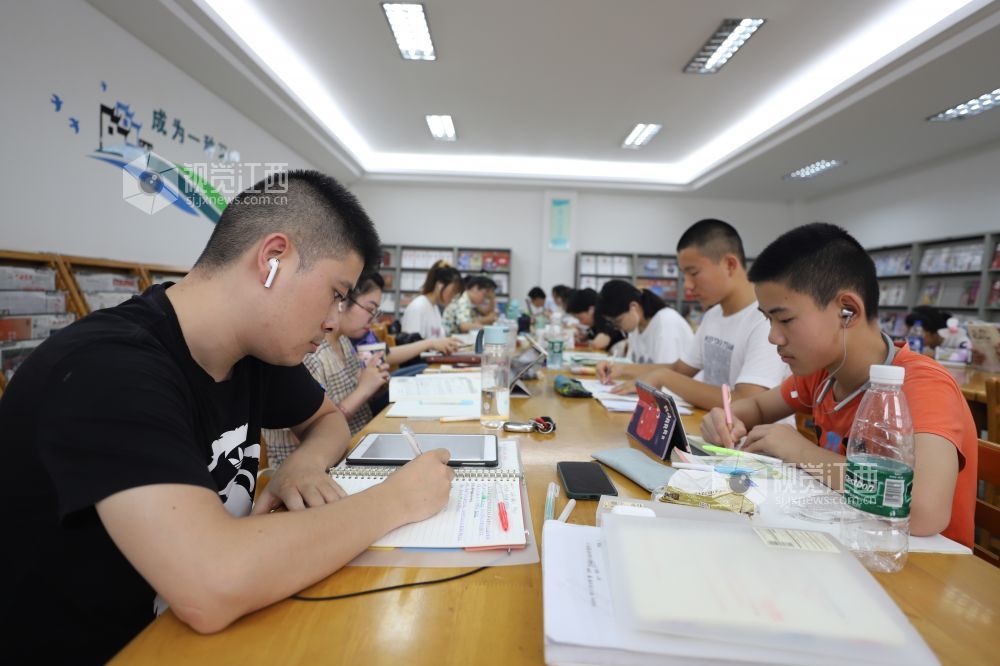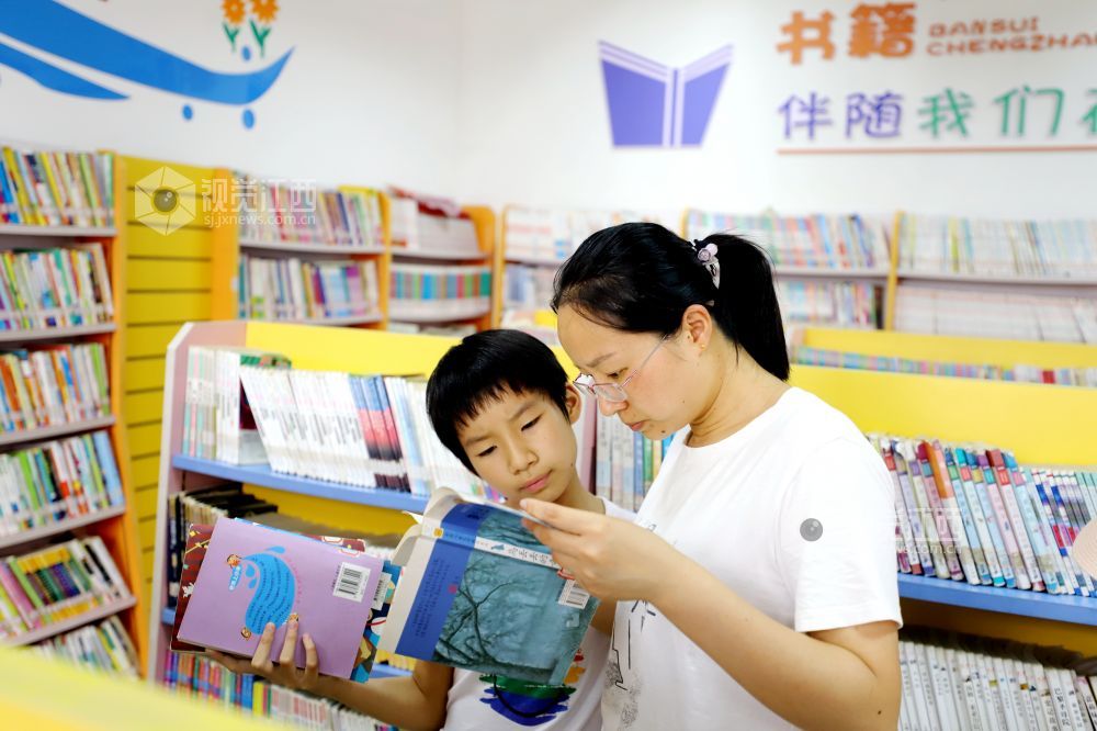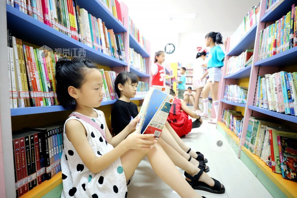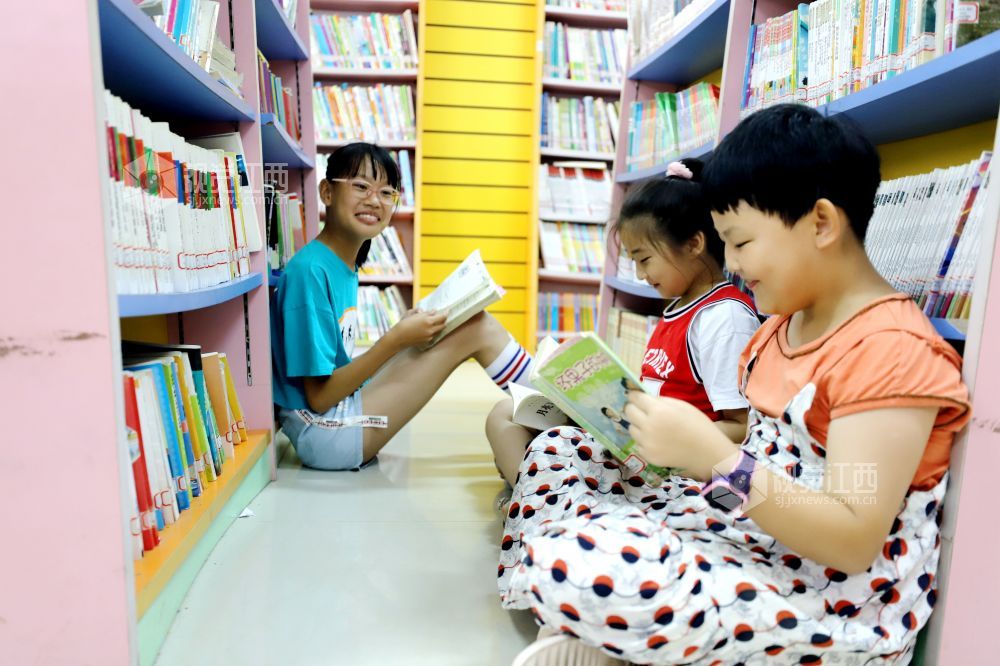 2021年7月11日,江西省九江市湖口县图书馆内,学生们在翻阅自己喜爱的图书,畅游书海。盛夏时节,市民在书香里觅书香、寻清凉,成为很多人的避暑选择。