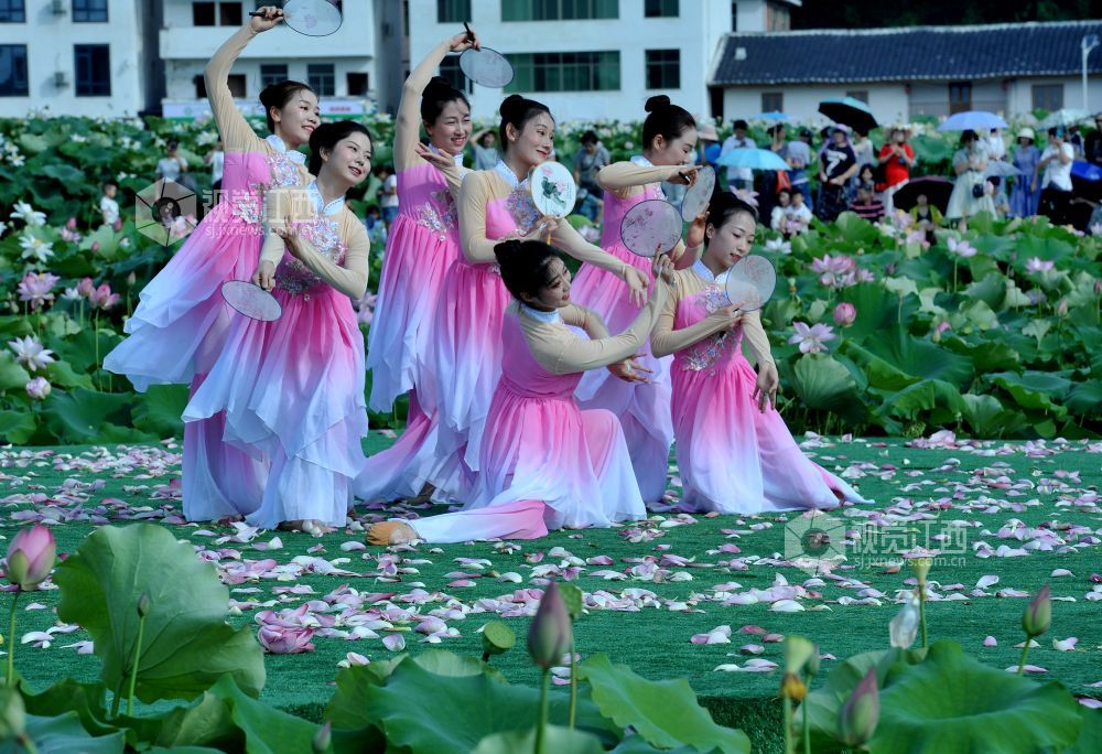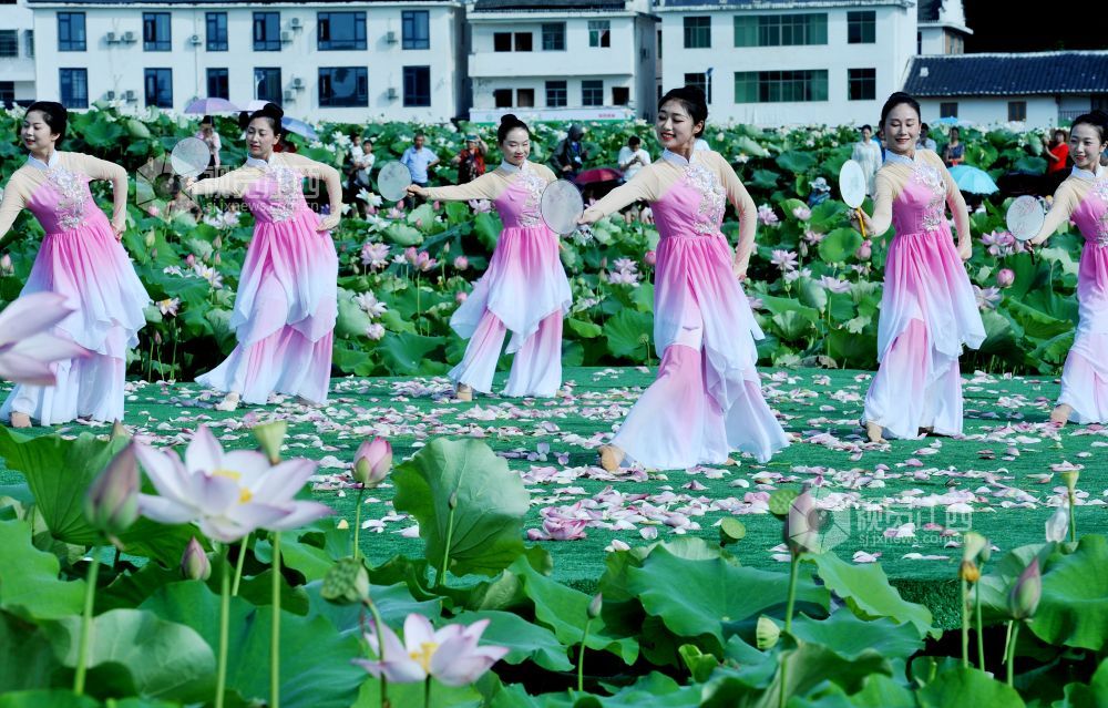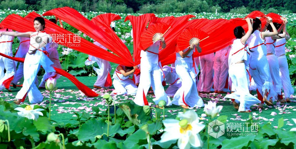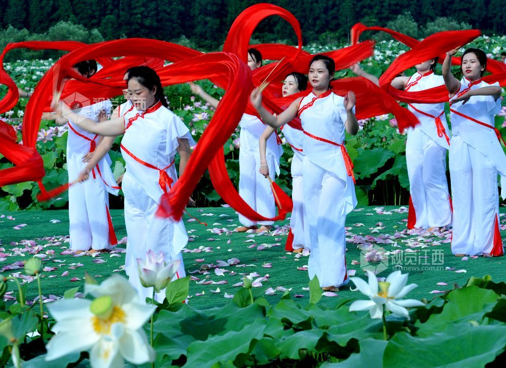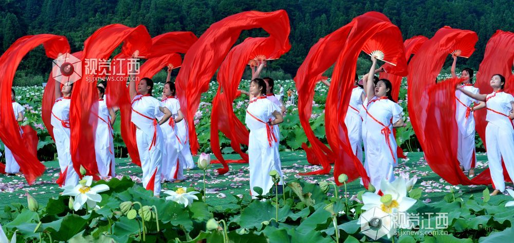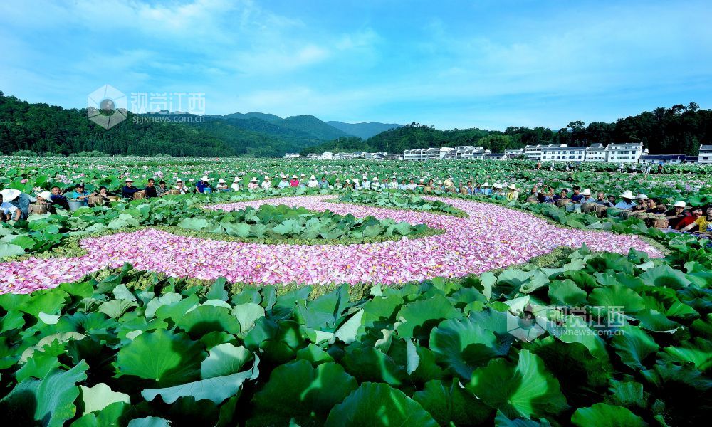 当天,在江西省抚州市广昌县驿前镇姚西村中国莲花景区,来自驿前镇各村的上百位脱贫莲农,用莲叶、去籽后的莲蓬和莲花瓣拼成了党徽图案,以这种独特的方式,表达对党和祖国的感恩和热爱之情。同时,荷田中表演的“莲韵古风”舞蹈美轮美奂,吸引了成千上万的游客前来观看拍照。