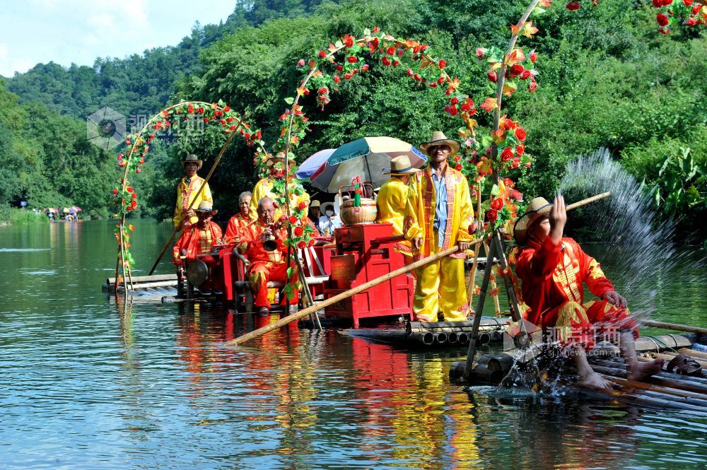 2021年7月9日,江西省抚州市广昌县杨溪乡抚河源竹筏漂景区,身穿古装的花轿“迎亲”队伍撑着竹筏,沿着抚河源头青山绿水顺流而下,与河两边良好的生态环境相映成景。
