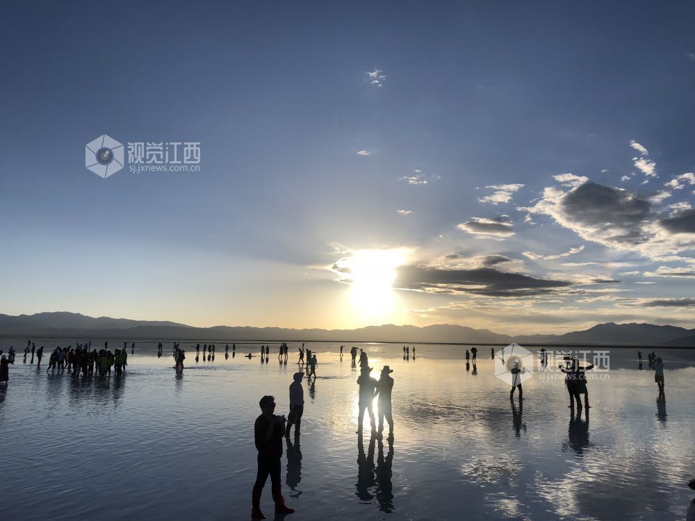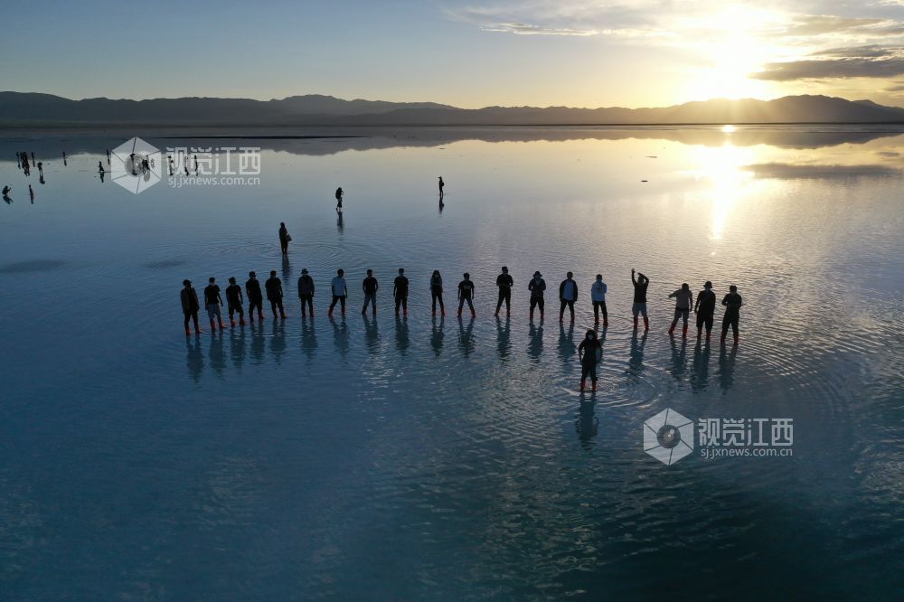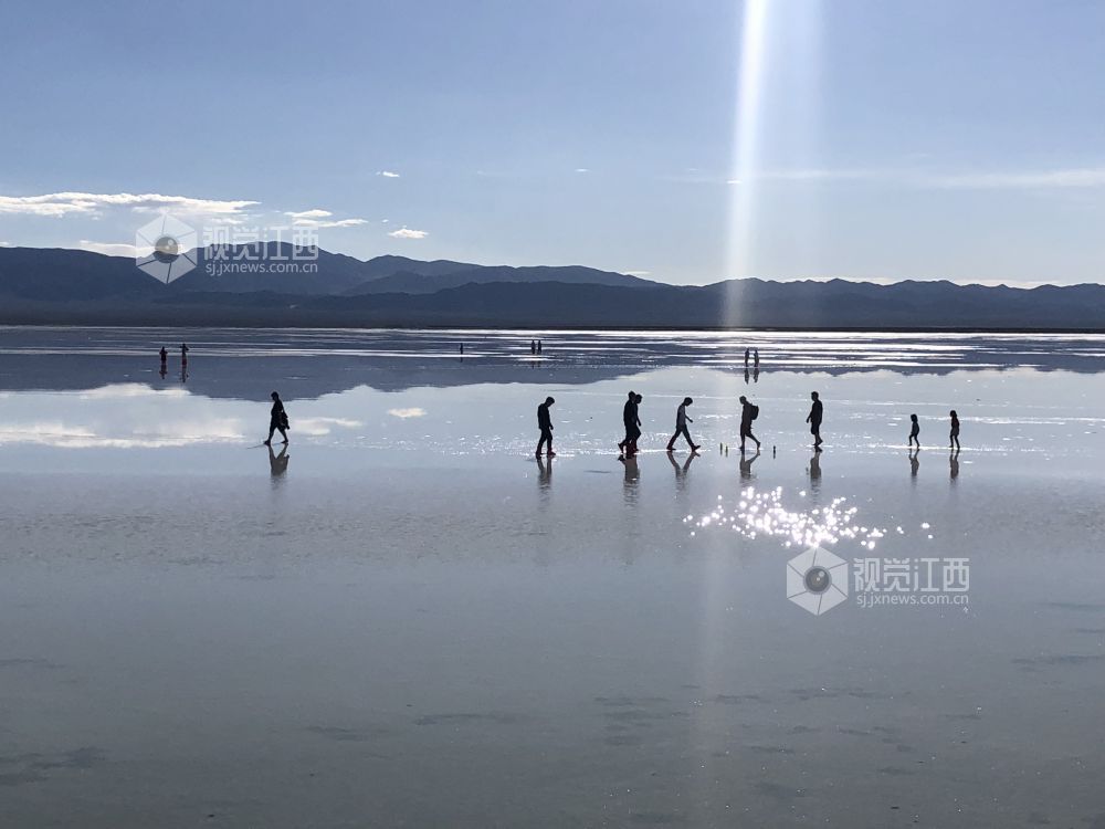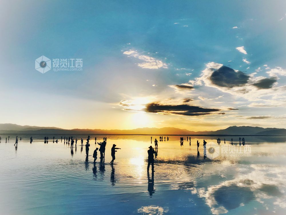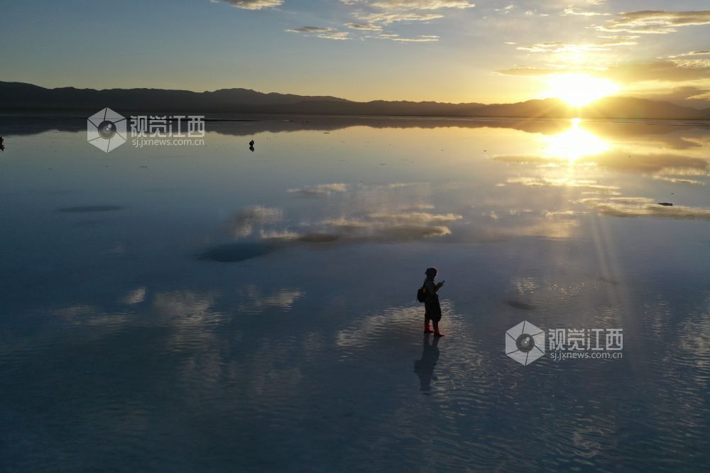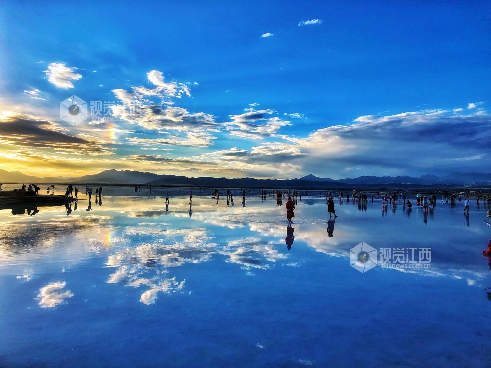 位于青海省乌兰县茶卡镇的茶卡盐湖,湖面辽阔空旷,湖水盐含量极高,会自然结晶成为一片白色的湖面,天空、云朵和对岸的山都倒映在湖里,景色非常漂亮,就像是一面为天空梳洗打扮的镜子。游客还可以赤脚走到湖面上观看和拍摄自己的倒影,犹如天空之境。