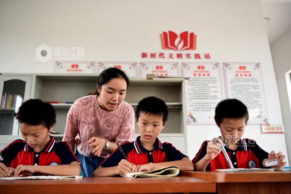 2021年7月19日,在江西省上饶市铅山县河口镇七里村新时代文明实践站,大学生志愿者正在为孩子们辅导作业。