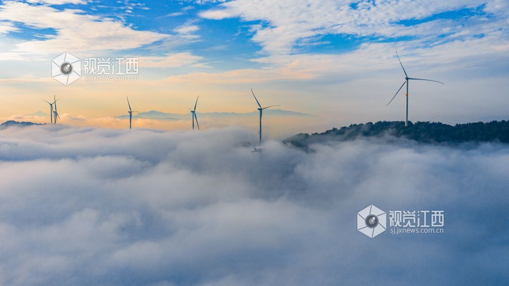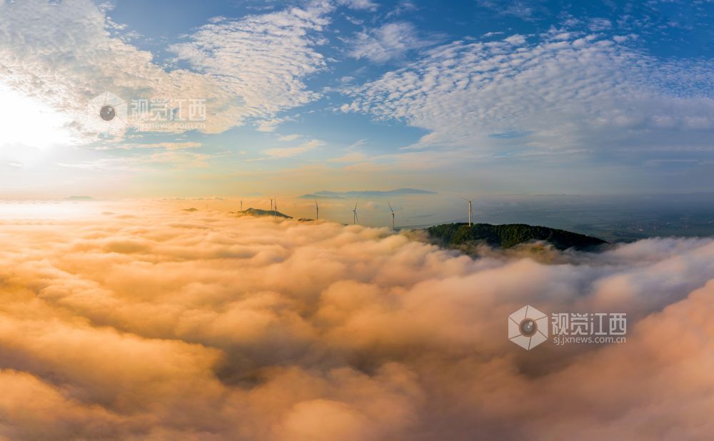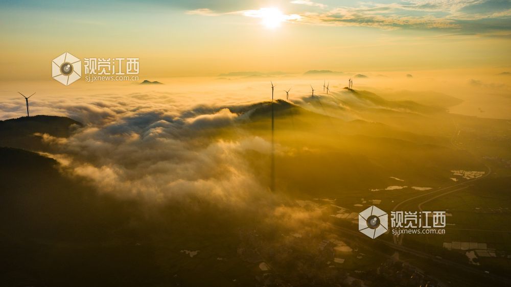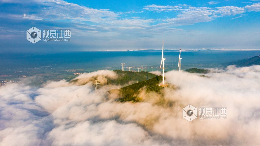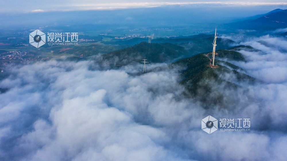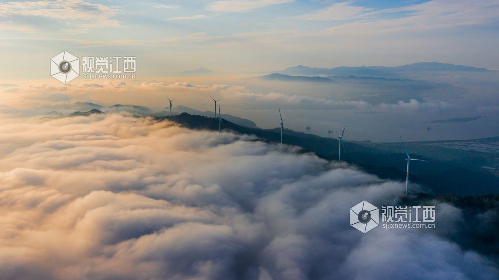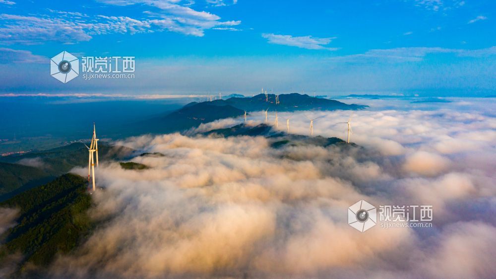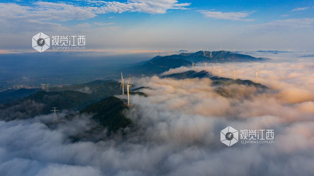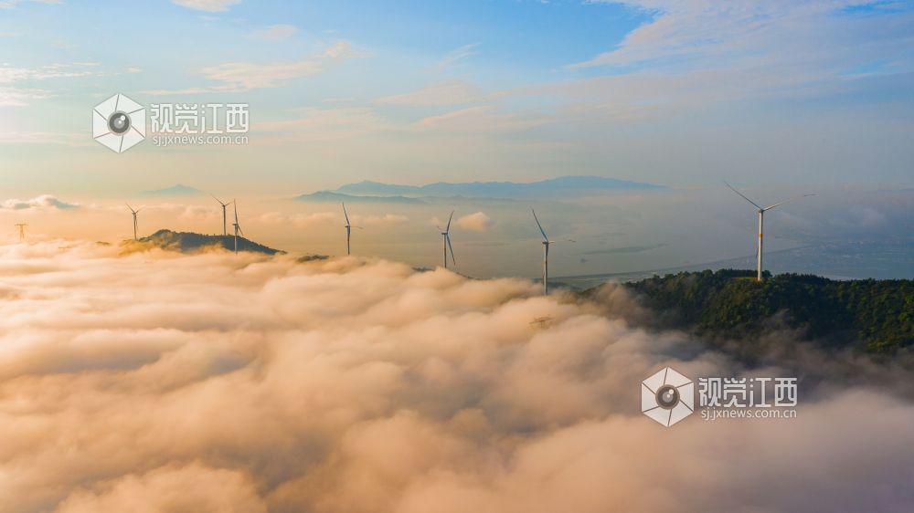 雨后放晴,一场云海与我不期而遇。在江西省峡江县罗田镇古井村委眼头村岭上出现云海景观,山上视野开阔,云雾如丝如带,缠在山尖,与天际相连,象是道道薄纱在天空中飘浮,太阳缓缓升起,朝霞光辉映在云海和风力发电机上,把眼前的景象变得如梦如幻,一幅幅水墨画又呈现开来,美不胜收。涌动的云海,青翠的山岭,转动的白色风机,构成峡江县罗田镇古井村委眼头村岭上一道靓丽的旅游风景线。