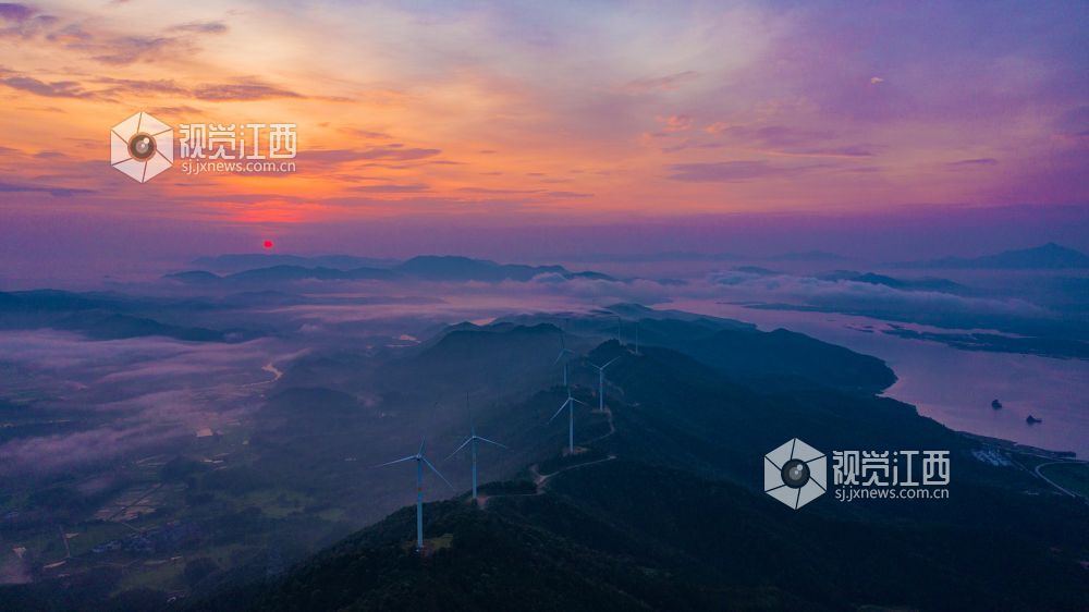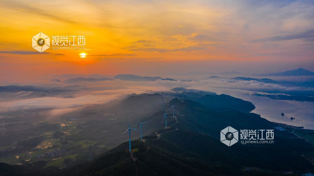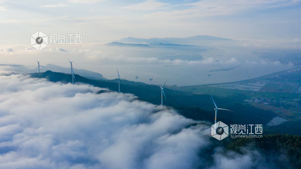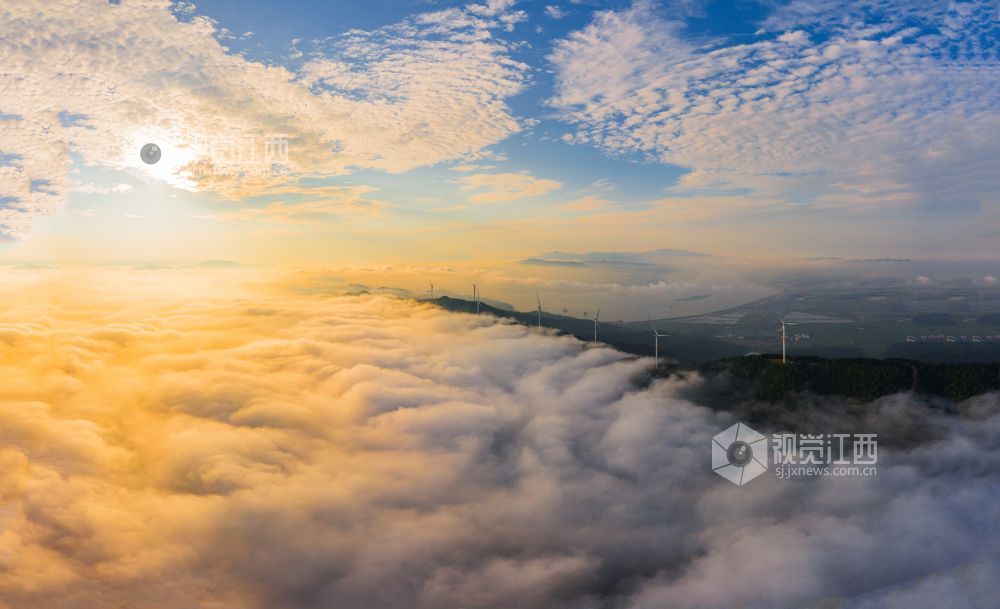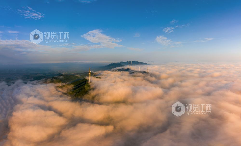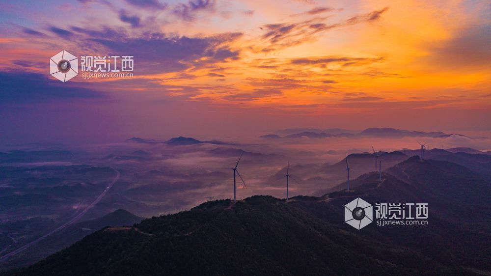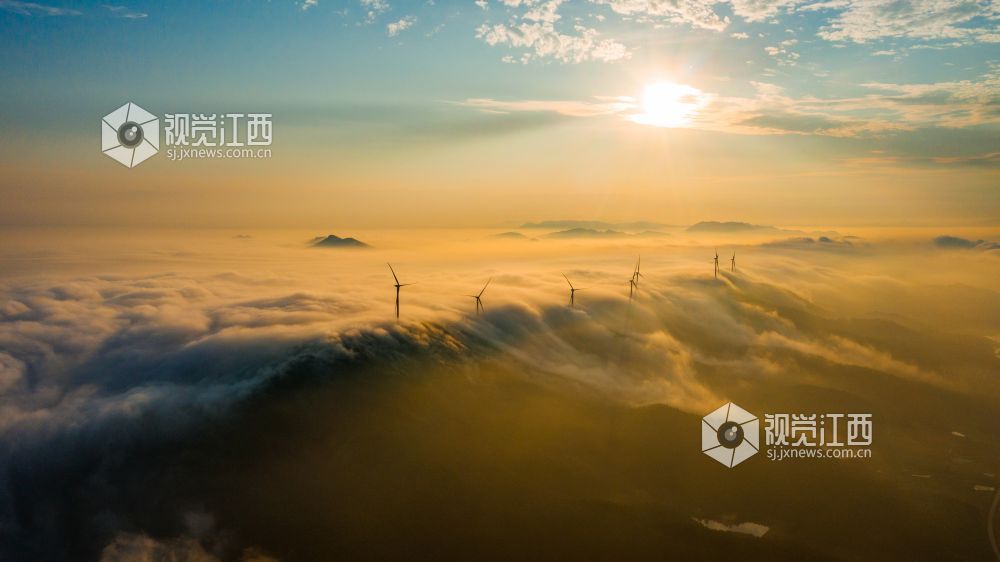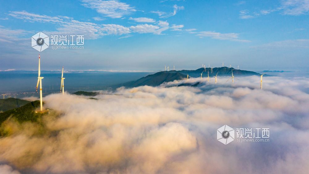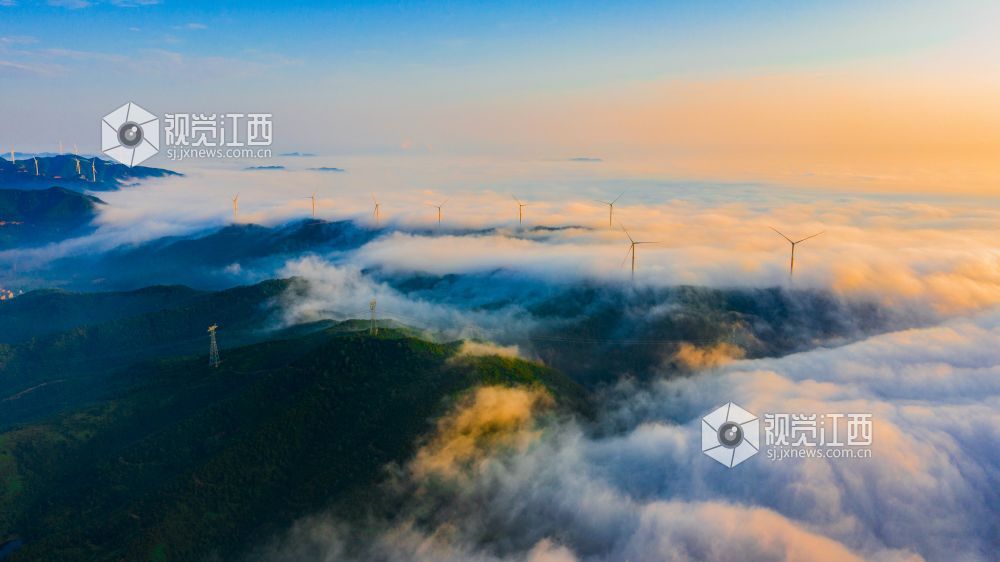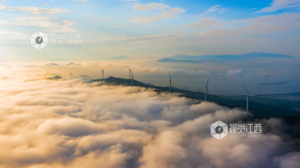 雨后放晴,一场云海与我不期而遇。在江西省峡江县罗田镇古井村委眼头村岭上出现云海景观,山上视野开阔,云雾如丝如带,缠在山尖,与天际相连,象是道道薄纱在天空中飘浮,太阳缓缓升起,朝霞光辉映在云海和风力发电机上,把眼前的景象变得如梦如幻,一幅幅水墨画又呈现开来,美不胜收。涌动的云海,青翠的山岭,转动的白色风机,构成峡江县罗田镇古井村委眼头村岭上一道靓丽的旅游风景线。