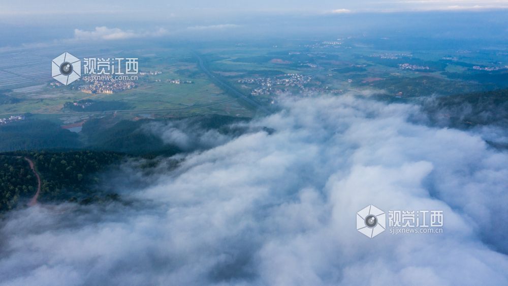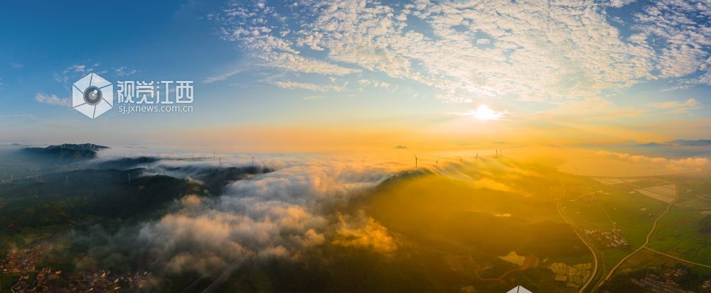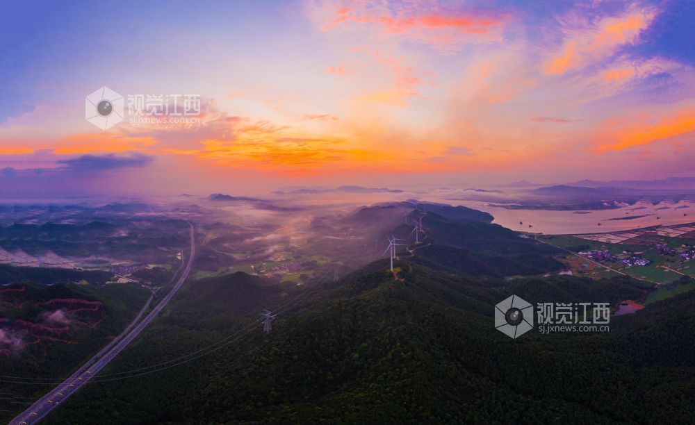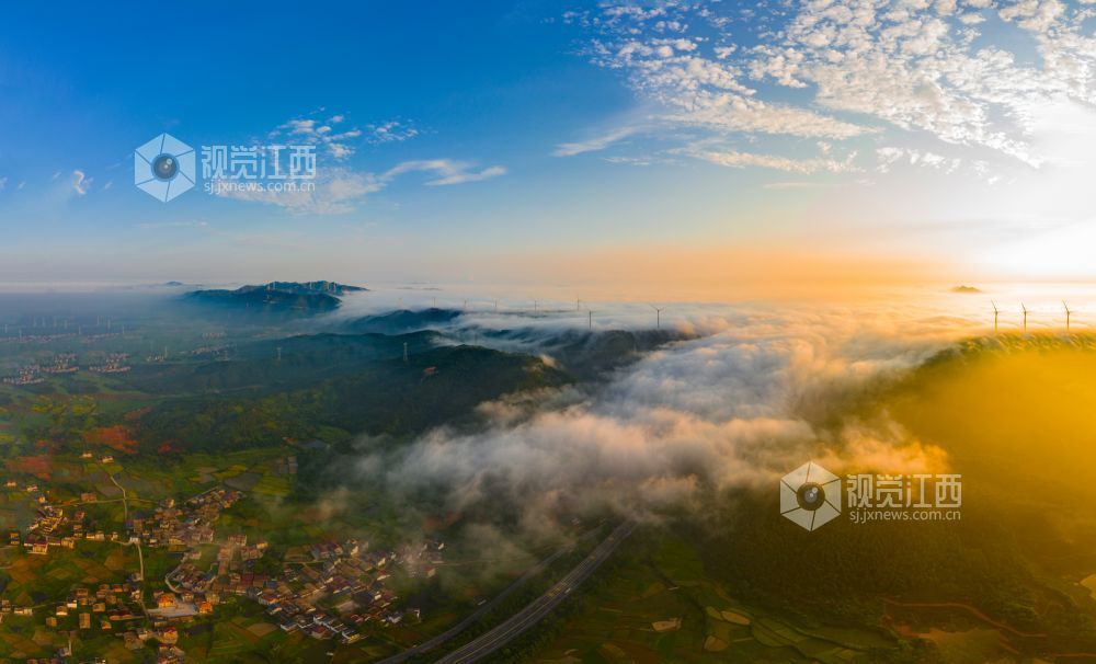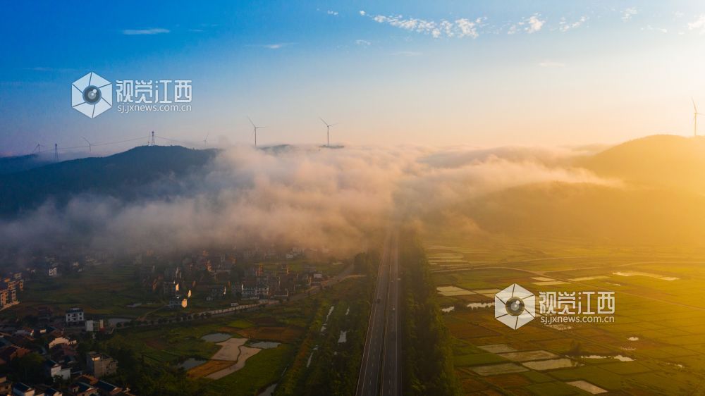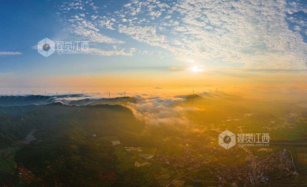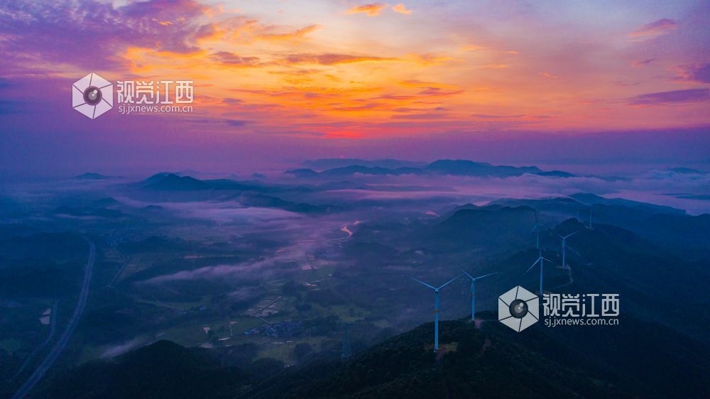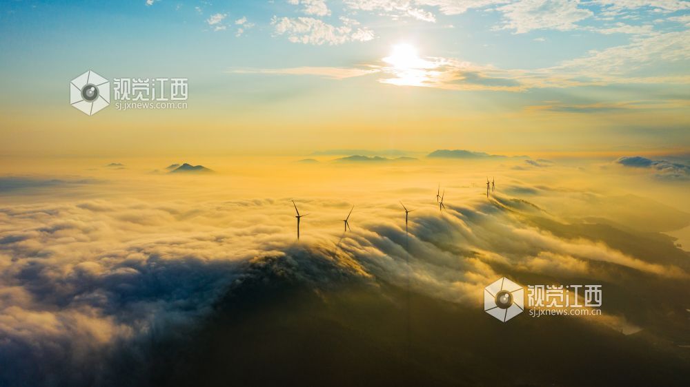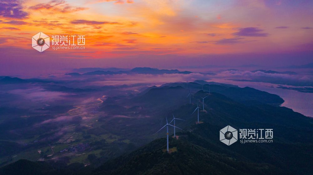 雨后放晴,一场云海与我不期而遇。在江西省峡江县罗田镇古井村委眼头村岭上出现云海景观,山上视野开阔,云雾如丝如带,缠在山尖,与天际相连,象是道道薄纱在天空中飘浮,太阳缓缓升起,朝霞光辉映在云海和风力发电机上,把眼前的景象变得如梦如幻,一幅幅水墨画又呈现开来,美不胜收。涌动的云海,青翠的山岭,转动的白色风机,构成峡江县罗田镇古井村委眼头村岭上一道靓丽的旅游风景线。