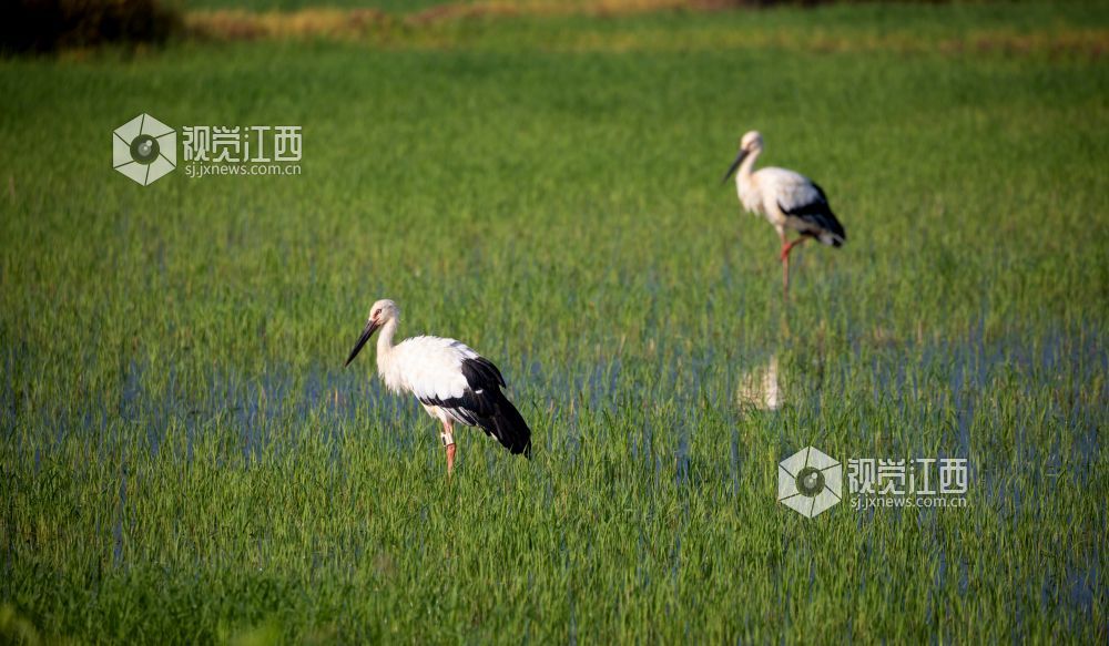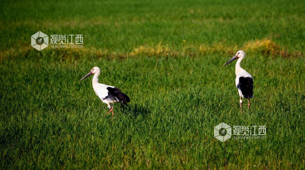 2021年7月21日,正值盛夏时节,两只国家一级保护动物——东方白鹳在江西省瑞昌市赤湖湿地嬉戏、觅食。