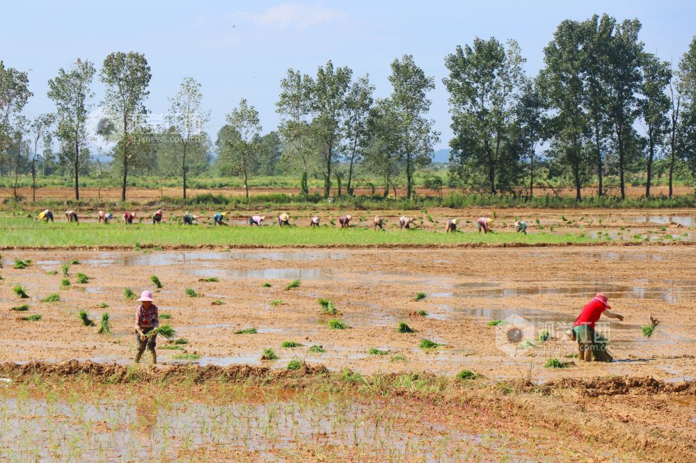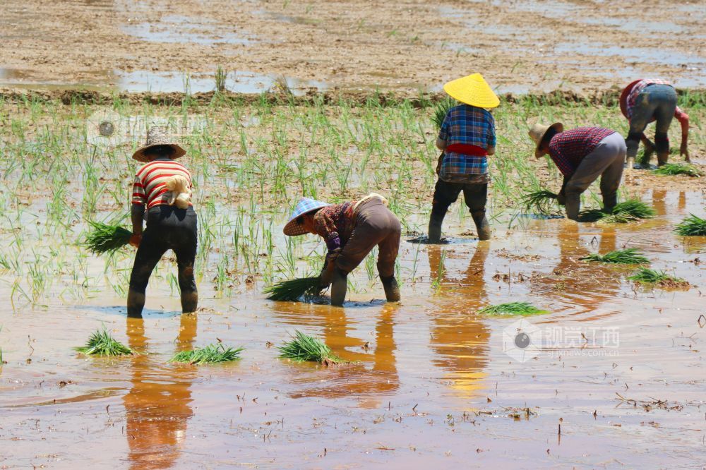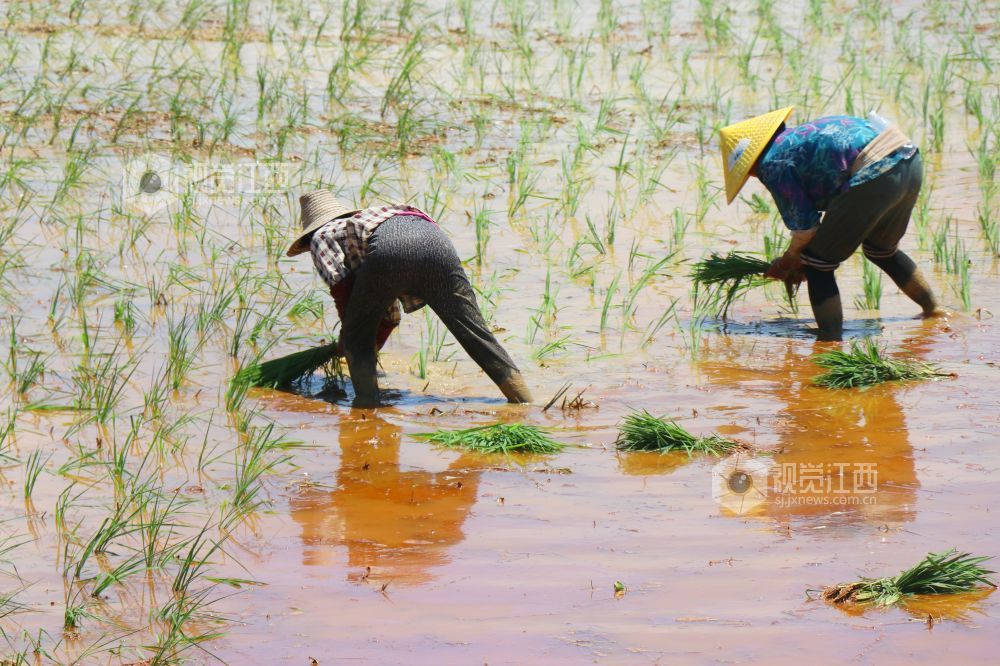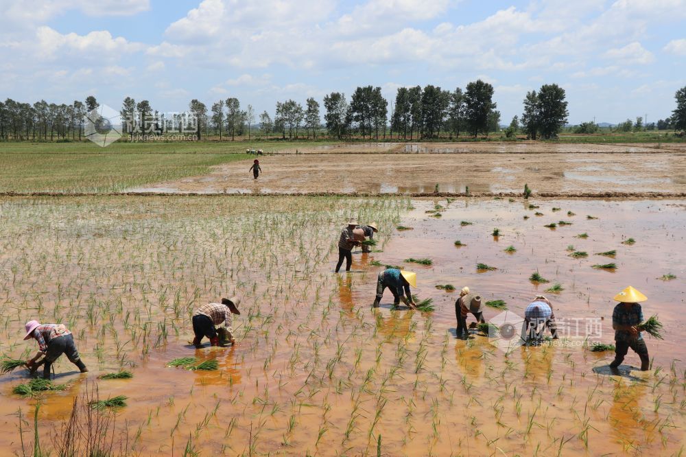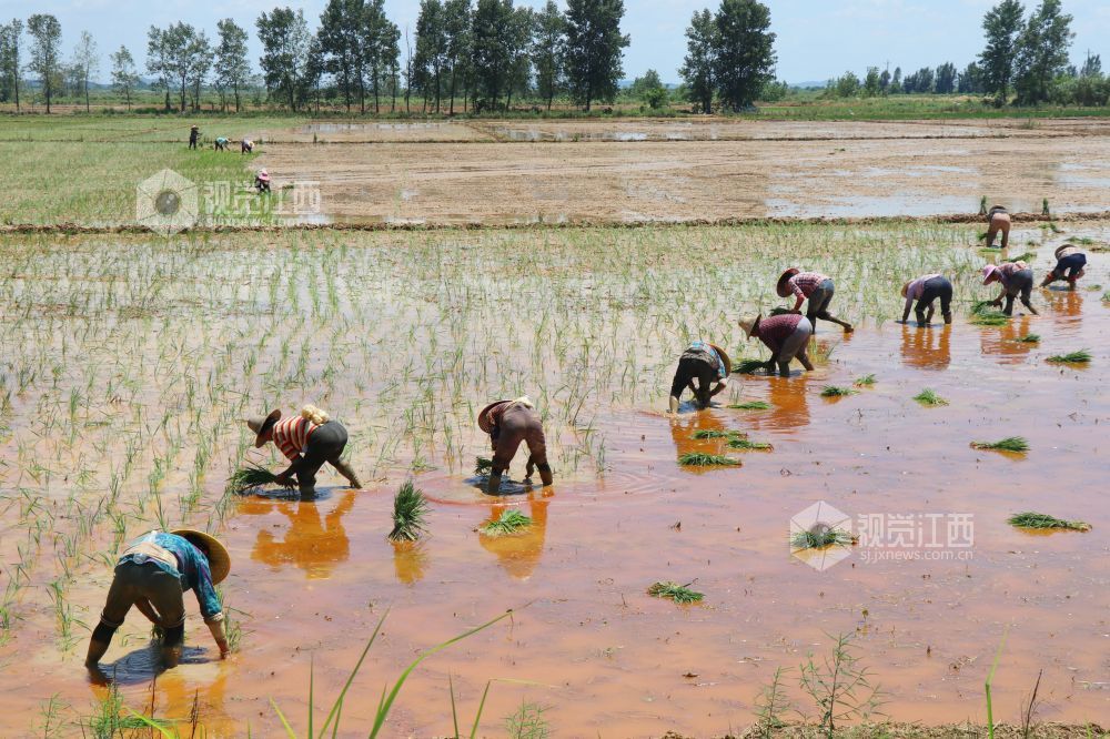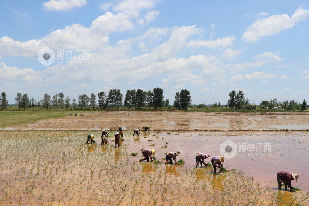 7月21日,江西省余干县康山垦殖场落脚湖分场,农户们在田间插秧。连日来,当地农户克服高温天气影响,抢插晚稻秧苗,田间地头呈现一派繁忙劳作景象。