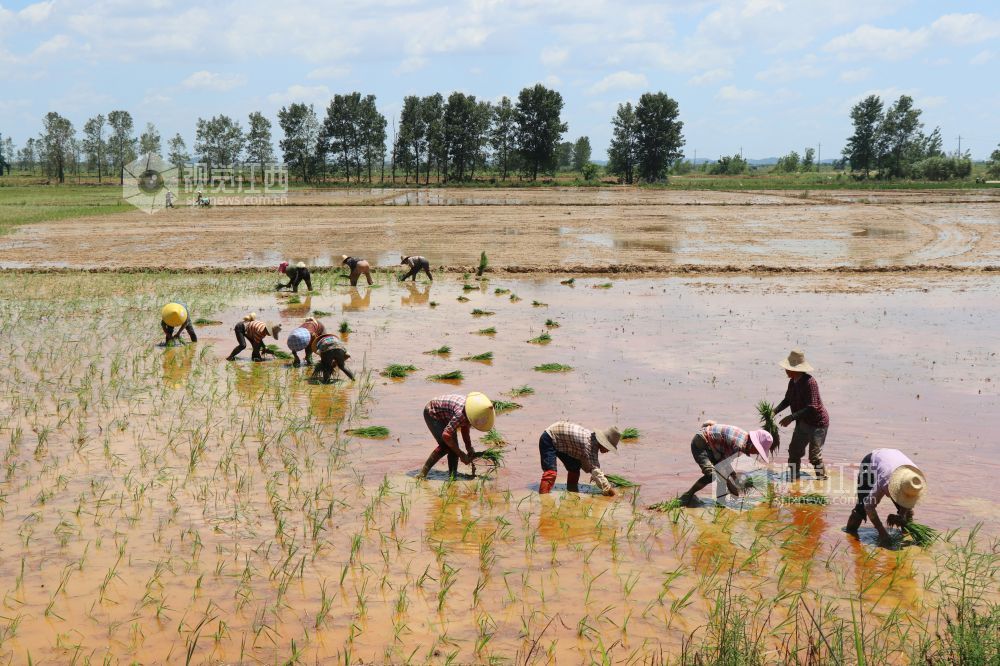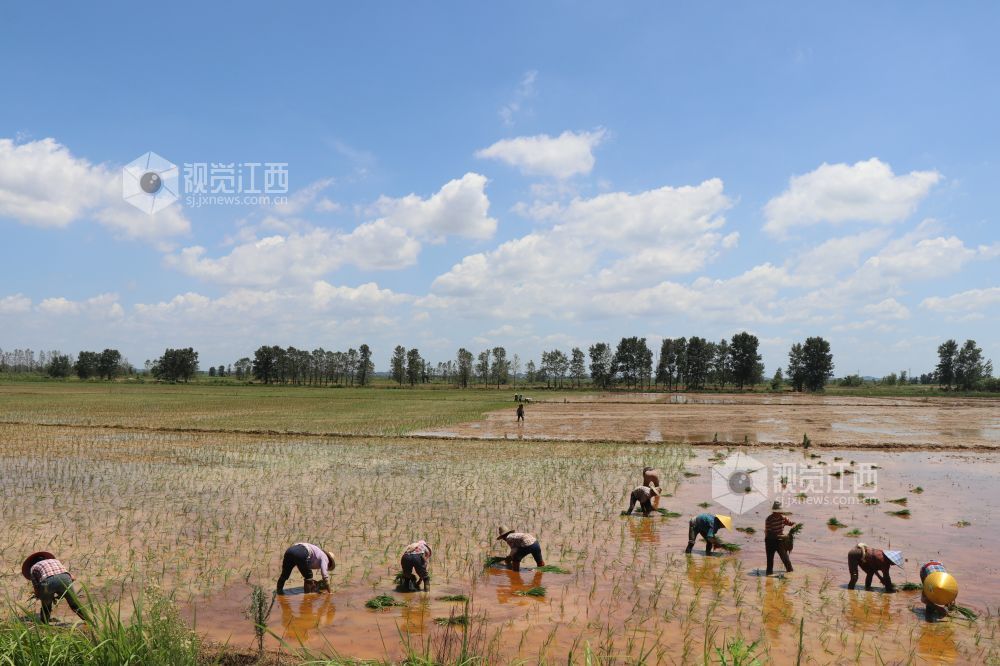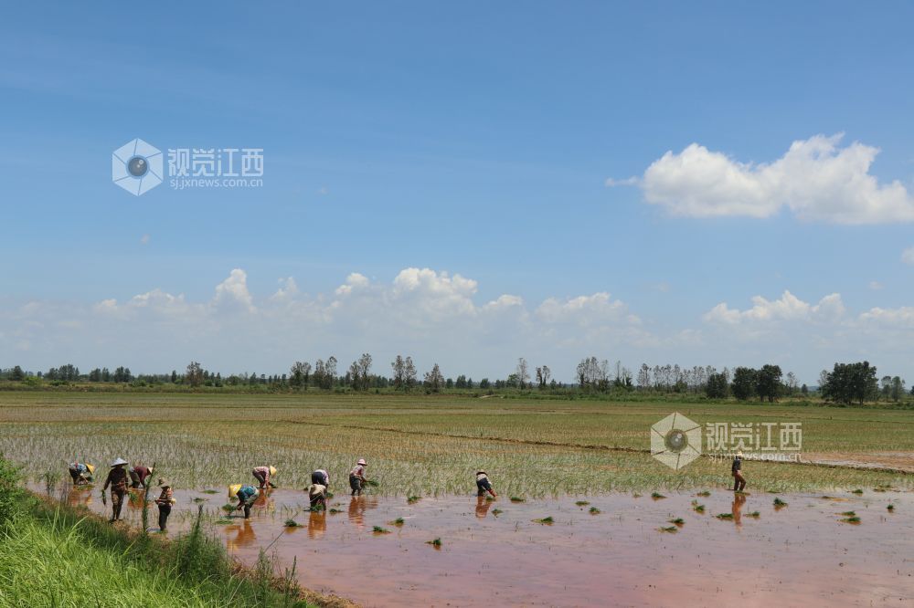 7月21日,江西省余干县康山垦殖场落脚湖分场,农户们在田间插秧。