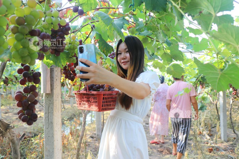 7月22日,在江西省余干县乌泥镇铜鼓包村葡萄采摘园内,一串串沉甸甸的葡萄挂满枝头,吸引不少游客前往采摘和品尝。