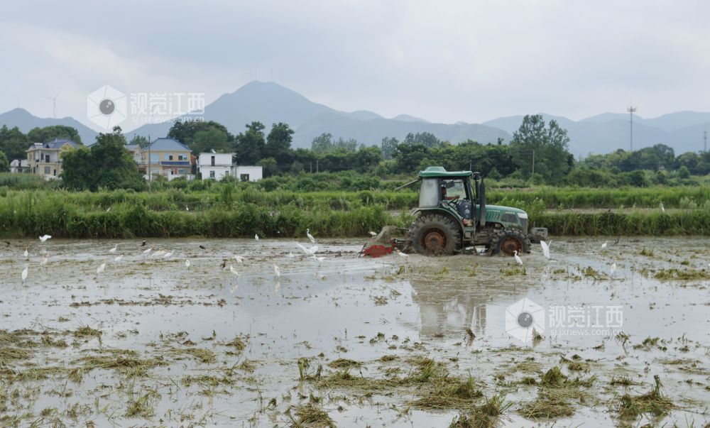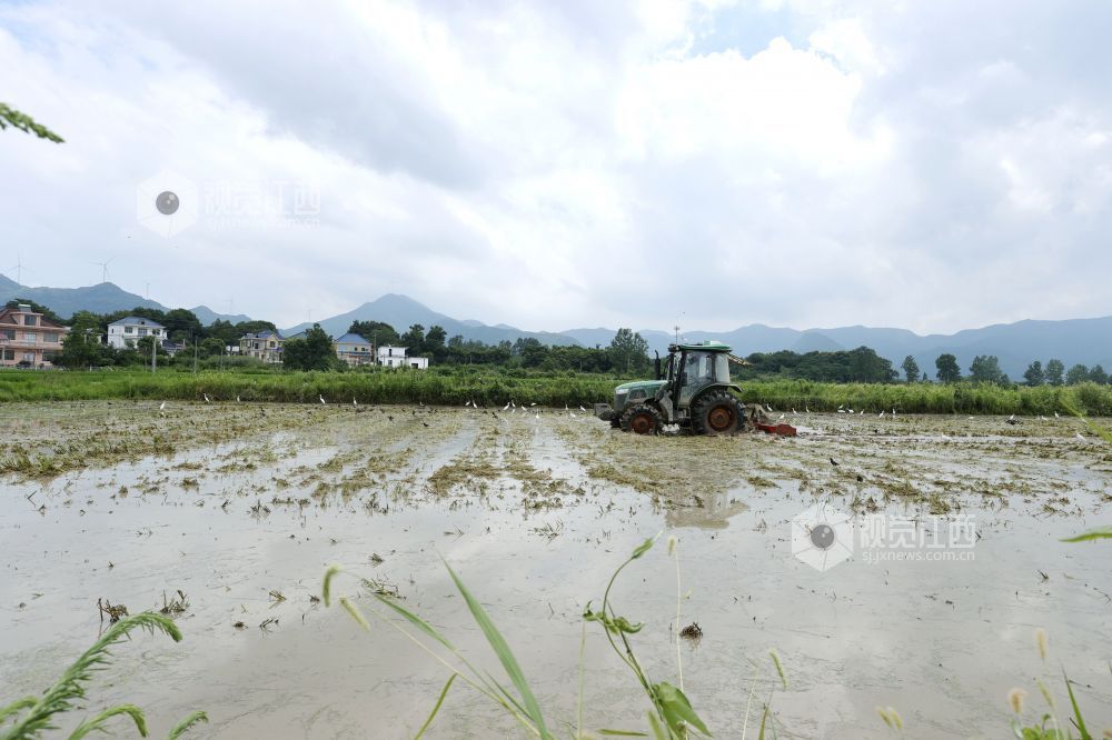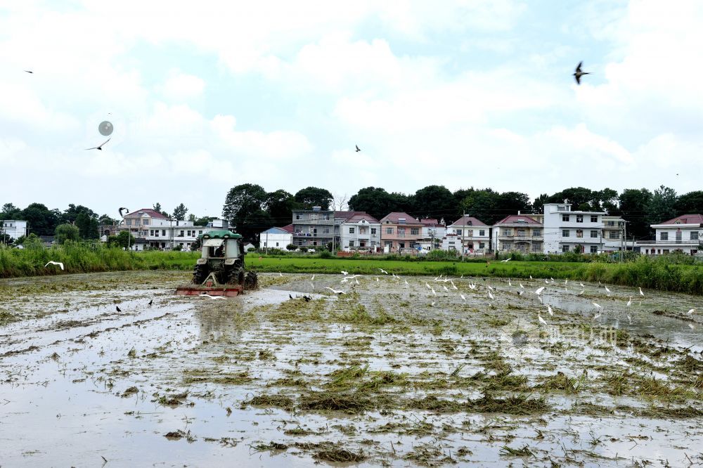 2021年7月23日,江西省九江市湖口县武山镇武联村村民正忙着耕田,成群的鹭鸟伴随着翻耕机翩翩起舞,栖息觅食,好一幅人与自然和谐共处的农耕画卷。