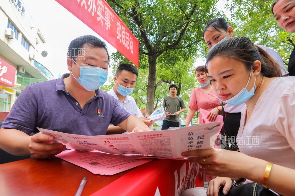 2021年7月25日,在江西省吉安市峡江县玉笥社区街头,该县纪检监察工作人员在向居民讲解信访举报知识。