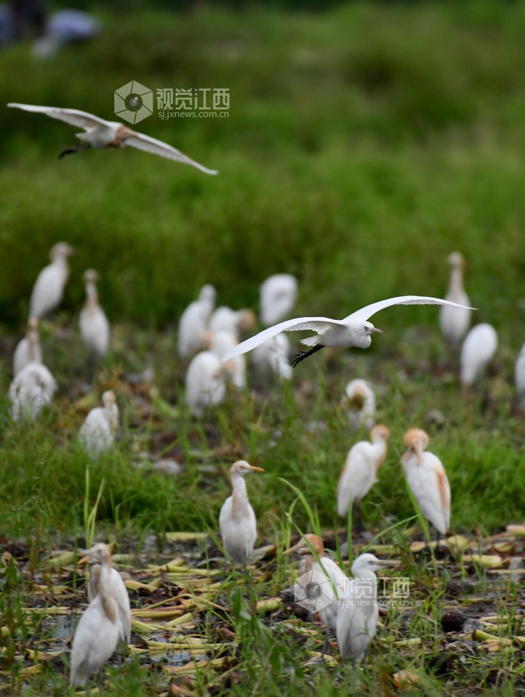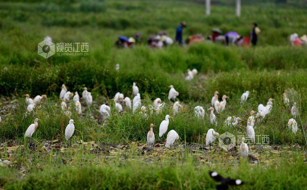 2021年7月25日,在江西省上饶市铅山县石塘镇十一都田畈上,一群白鹭在觅食。