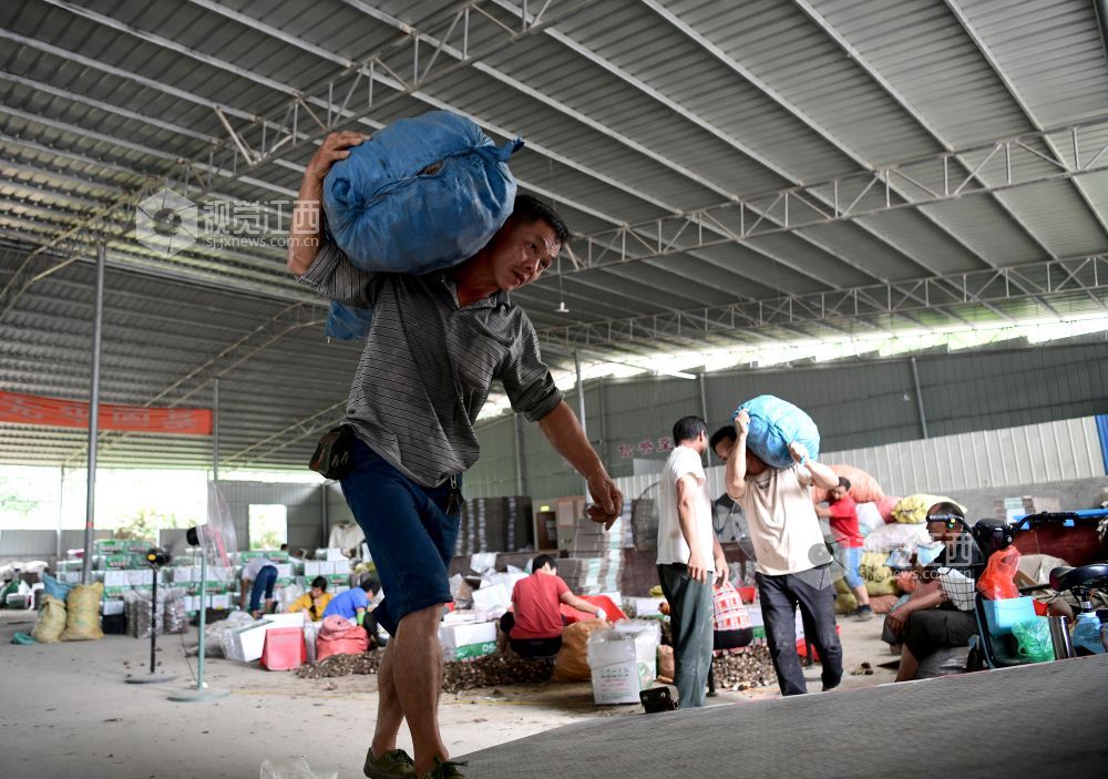 2021年7月25日,在江西省上饶市铅山县紫溪乡紫文蔬菜专业合作社基地,村民正在分拣芋头。