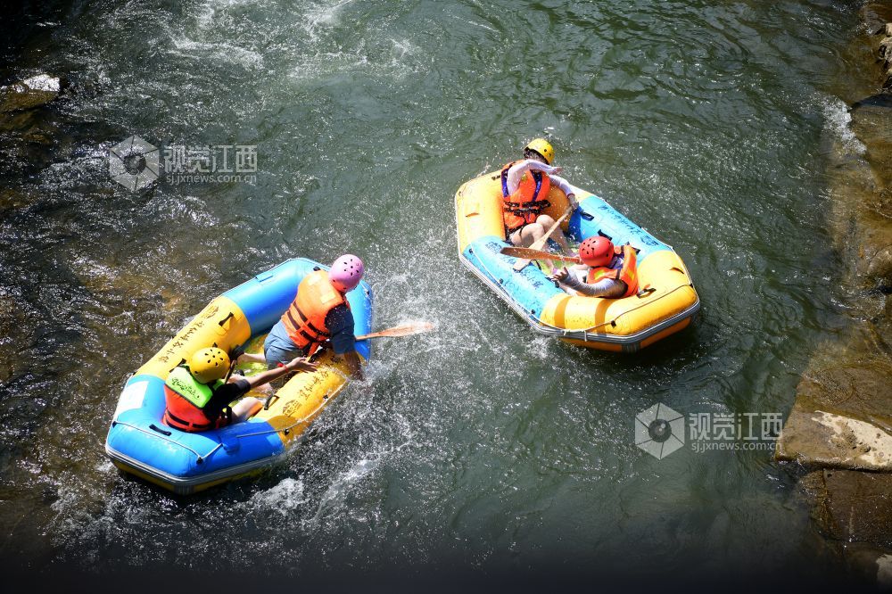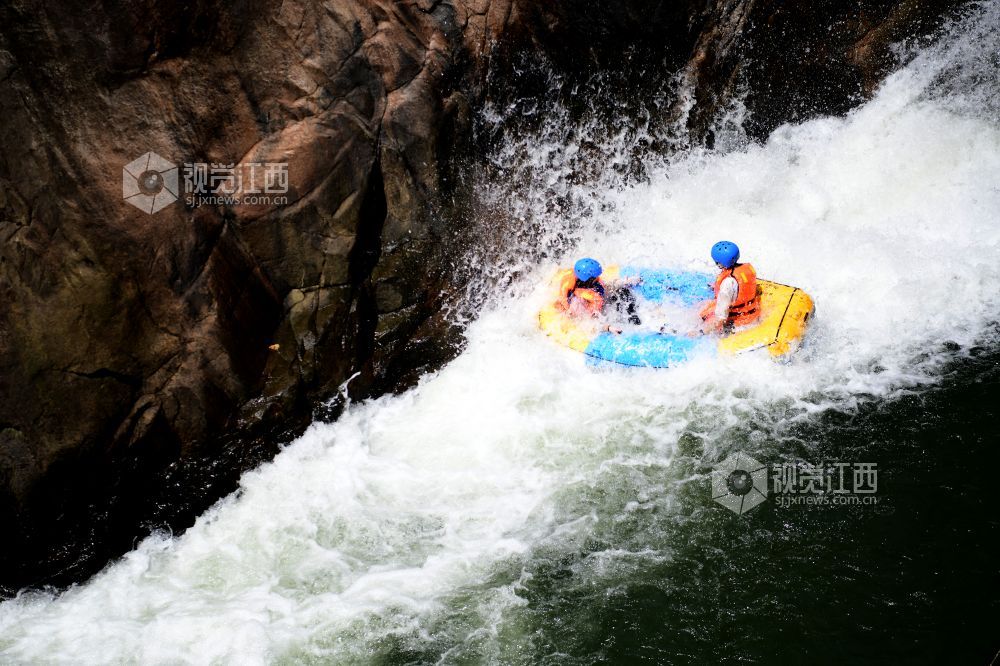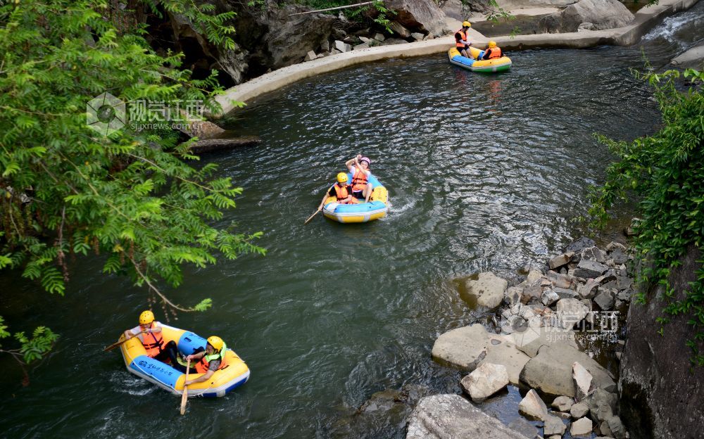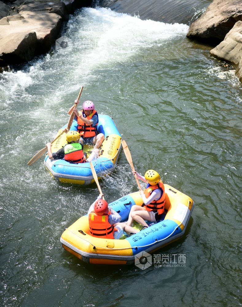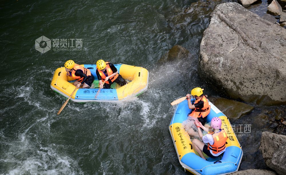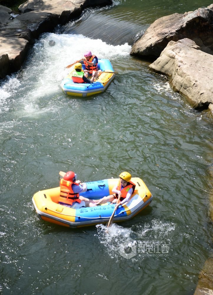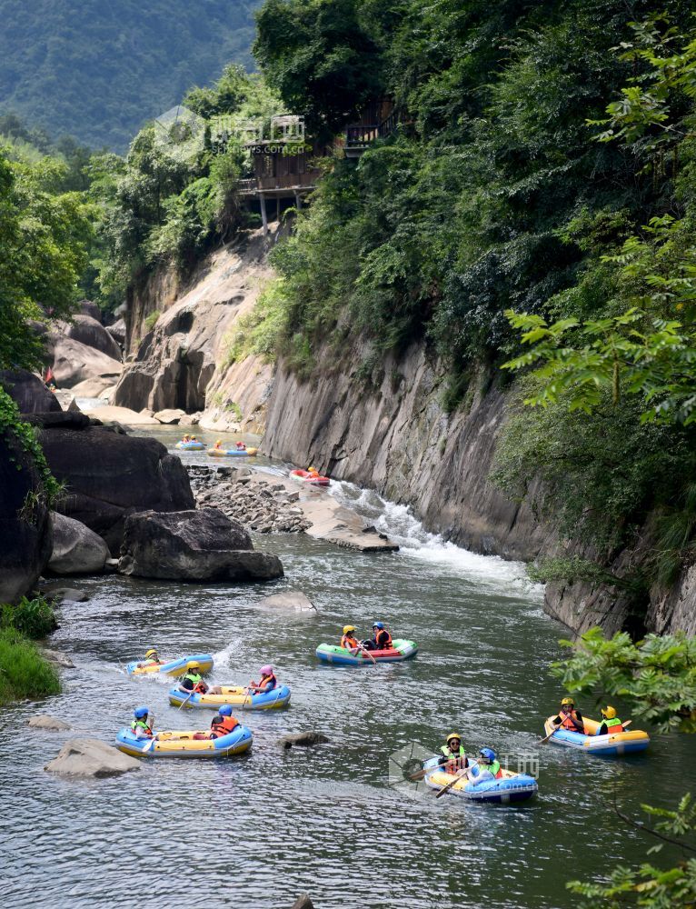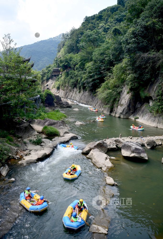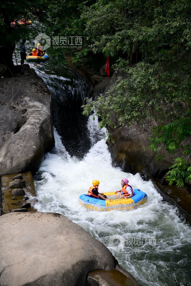 2021年8月8日,在江西省上饶市广信区望仙谷景区,游客正在峡谷中漂流戏水。