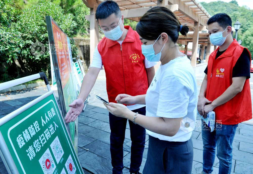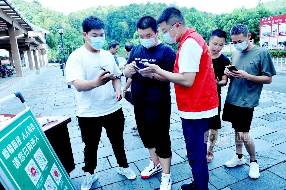 2021年8月8日,江西省德兴市大茅山风景名胜区党员干部正在景区入口,协助检票员做好游客进入景区前的防疫体温检测。