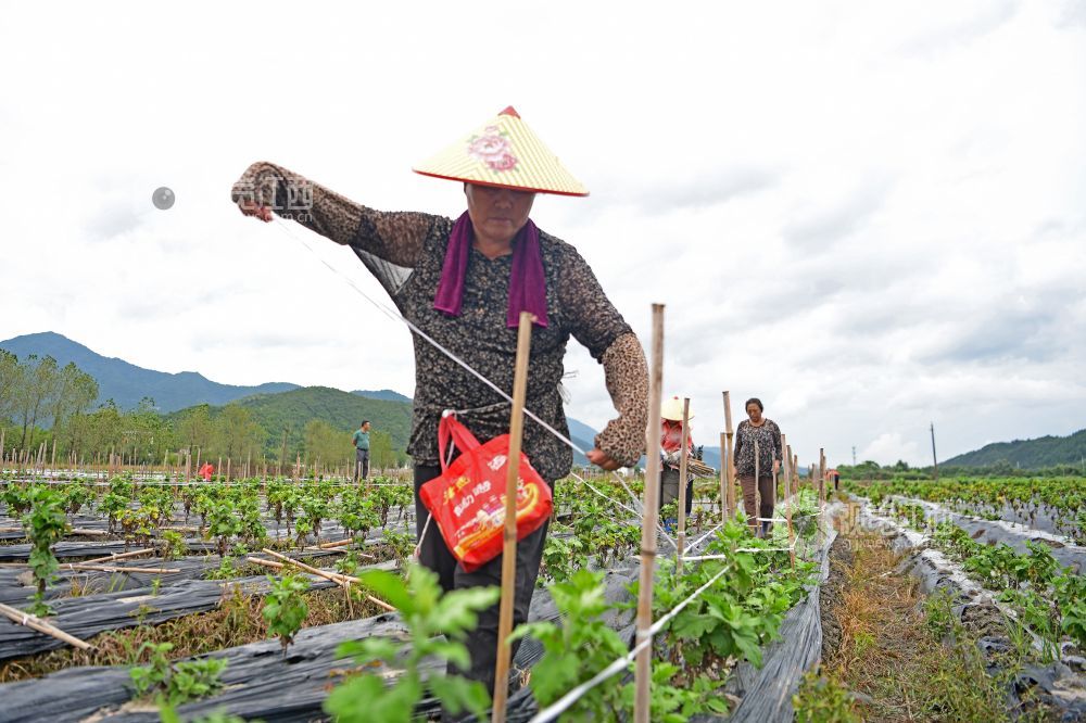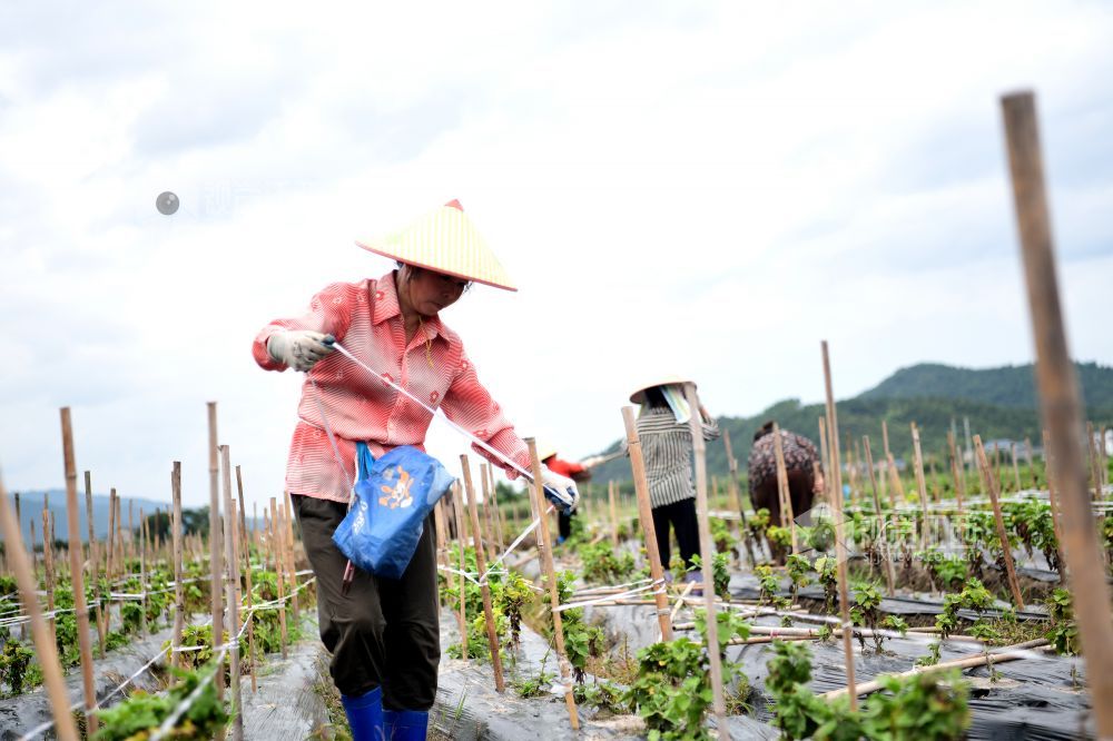 2021年8月11日,在江西省上饶市铅山县陈坊乡陈坊村田畈上,村民正在菊花地里作业。初秋时节,铅山县陈坊乡村民抢抓农时,除草施肥,打竹竿固定菊花茎秆,为秋季丰收打好基础。