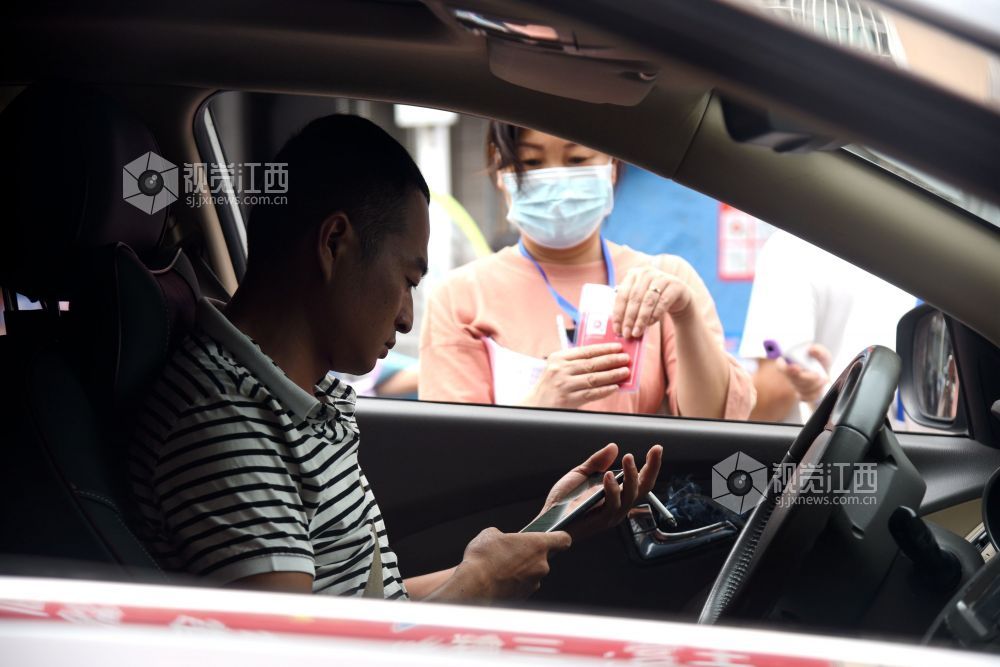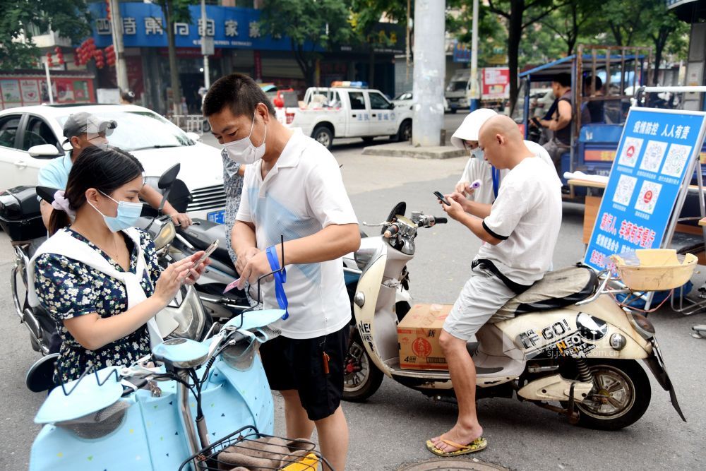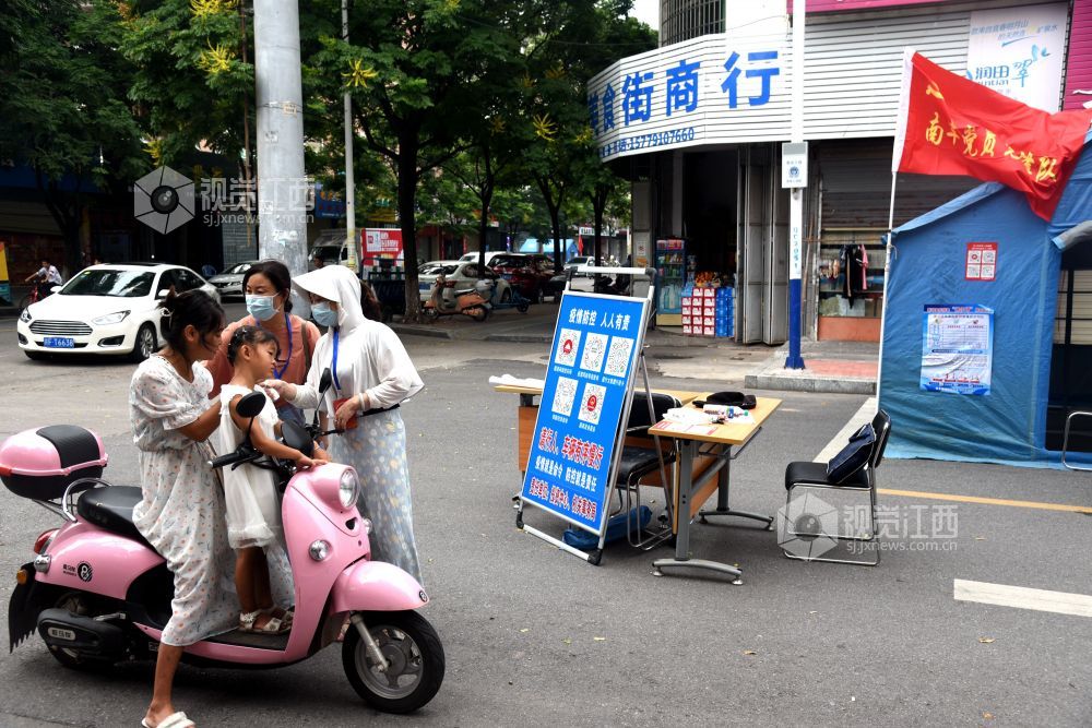 2021年8月12日,江西省抚州市南丰县琴城镇桔都西路社区党员先锋队志愿者对进入美食街小区人员查验“四查一戴”情况,落实防控措施。