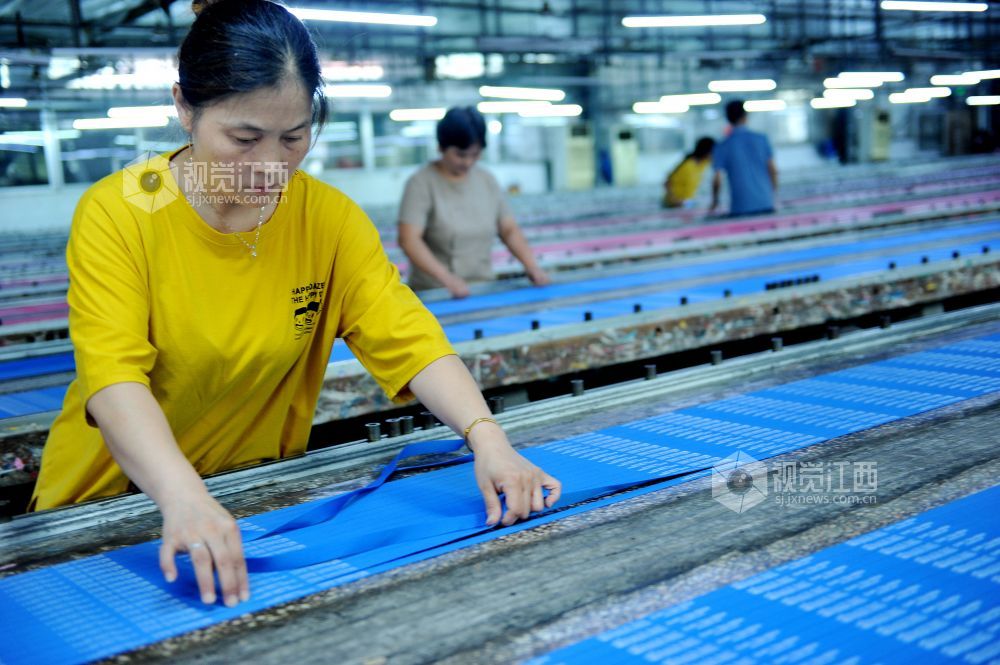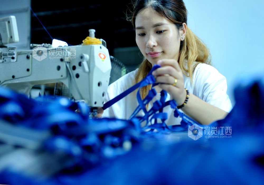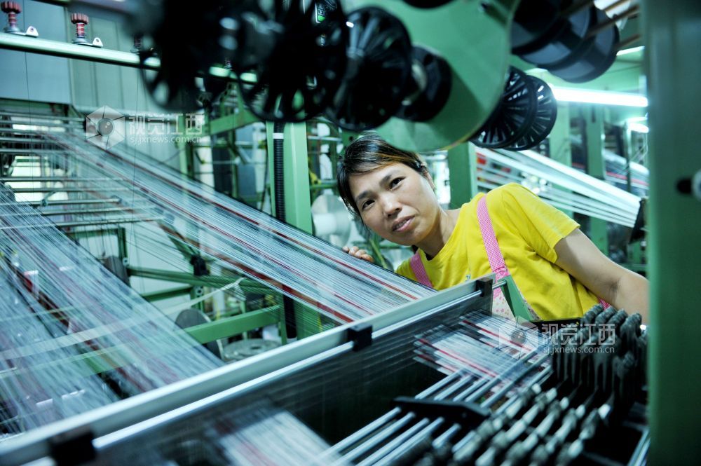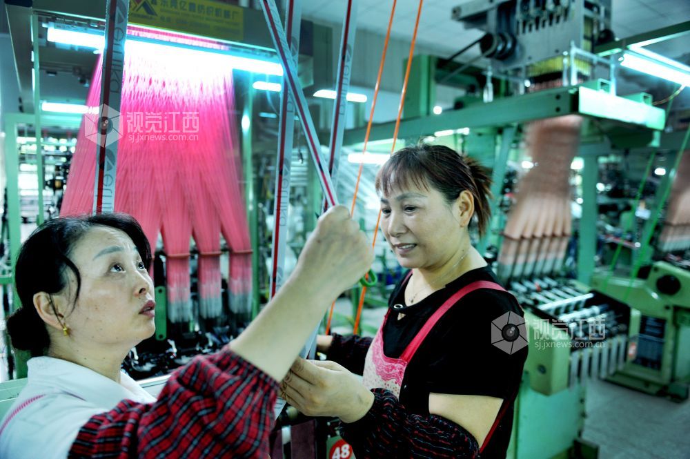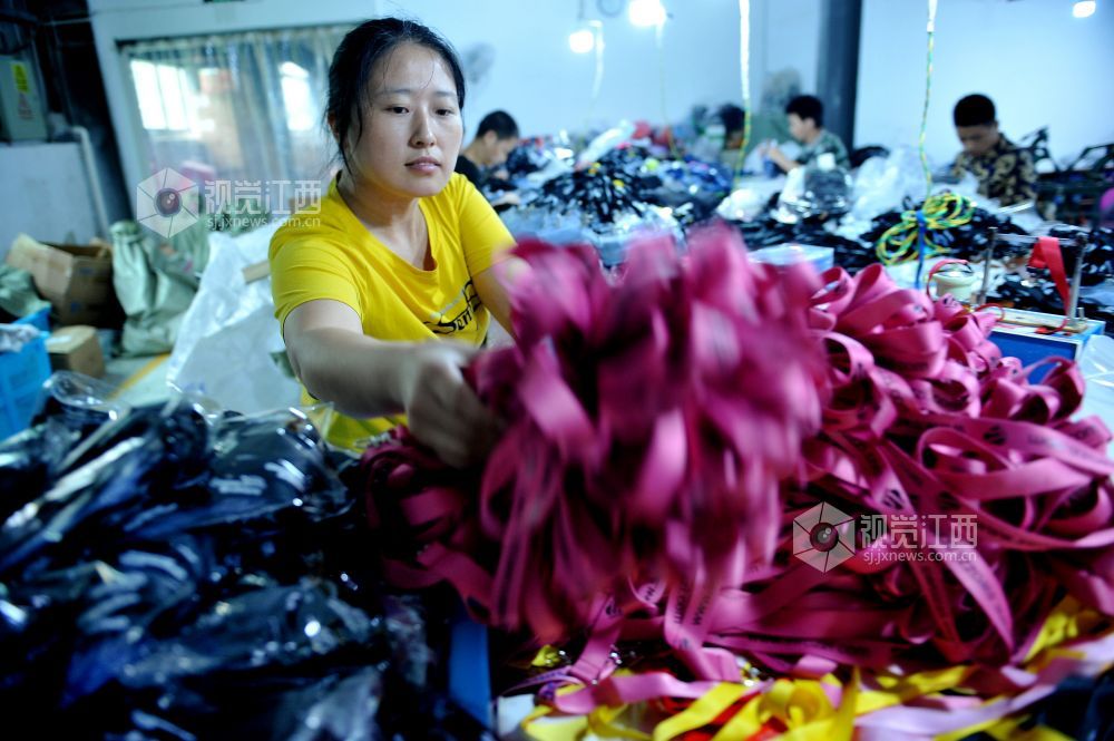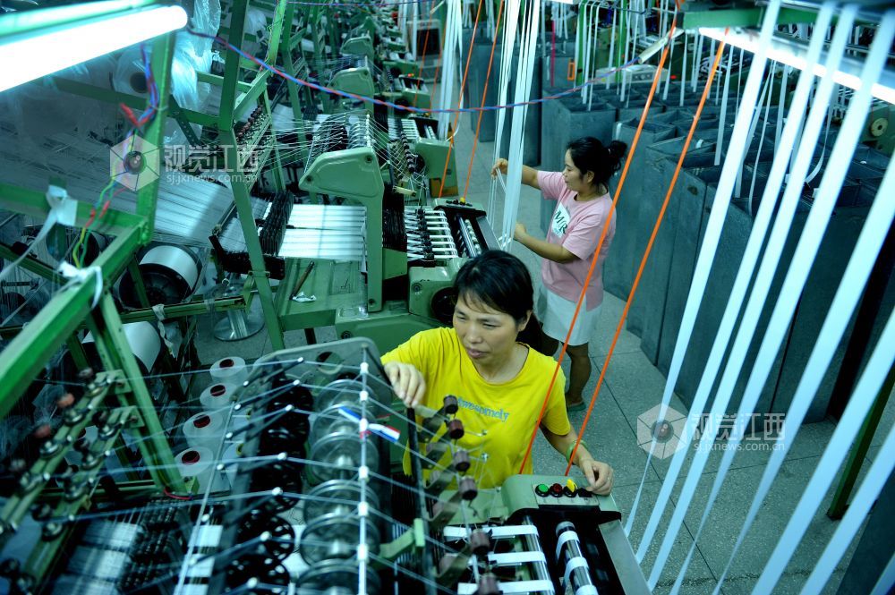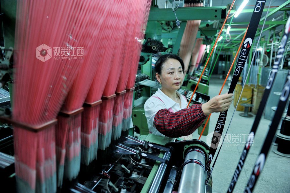 2021年8月15日,江西省德兴市一织造有限公司的员工正在赶制出口欧洲的订单编织挂带。