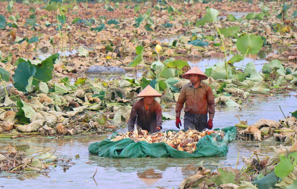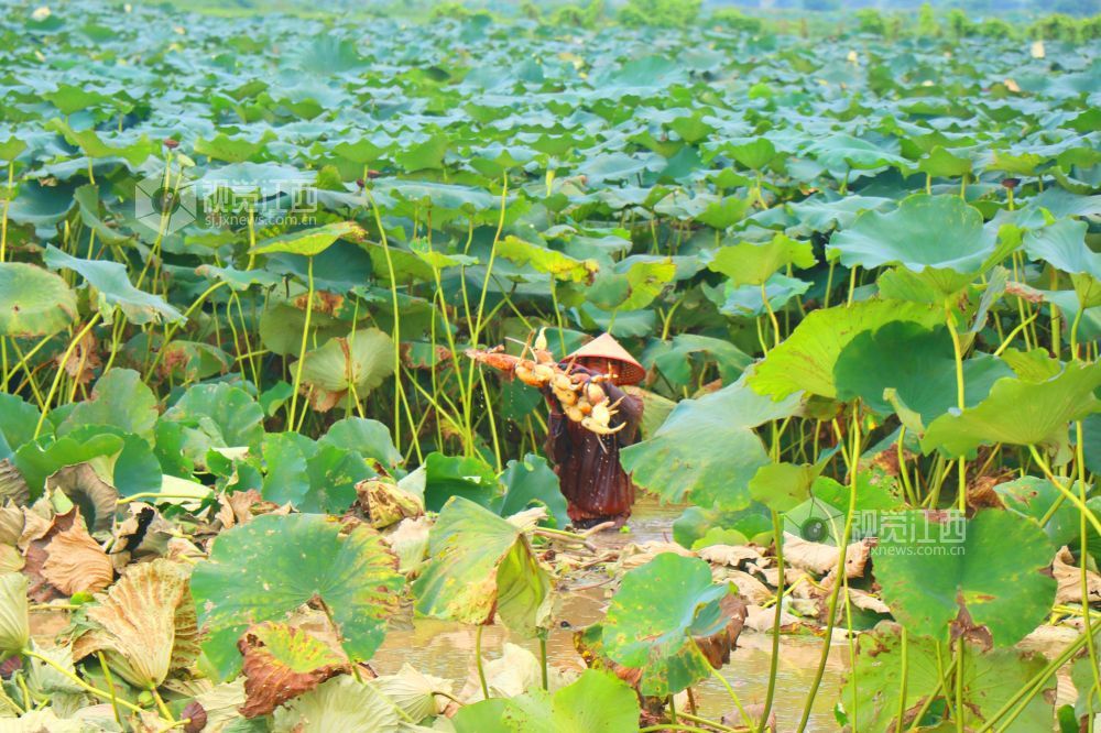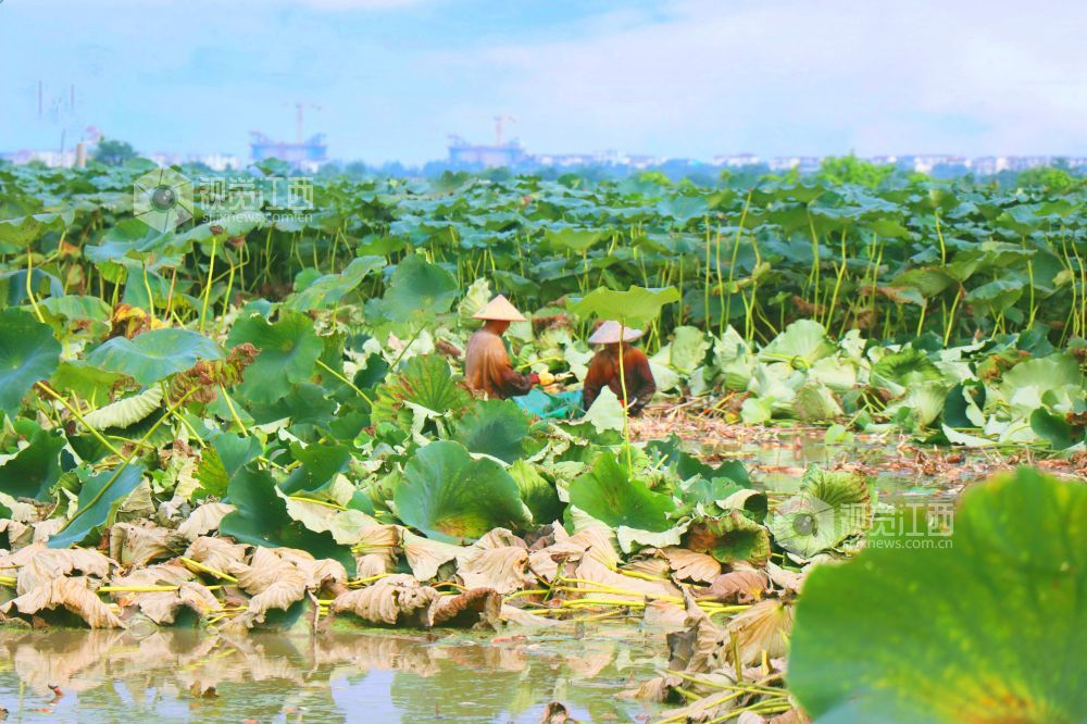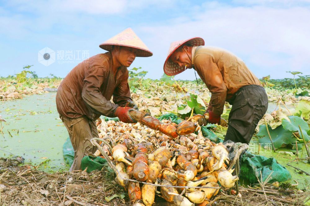 8月22日,江西省余干县乌泥镇鄱湖莲藕生态种植专业合作社莲藕基地,藕农正忙着采挖新鲜莲藕上市。