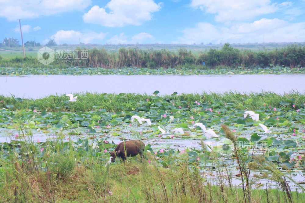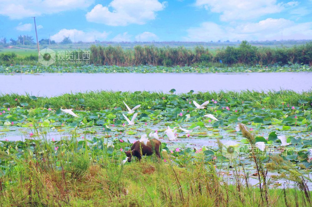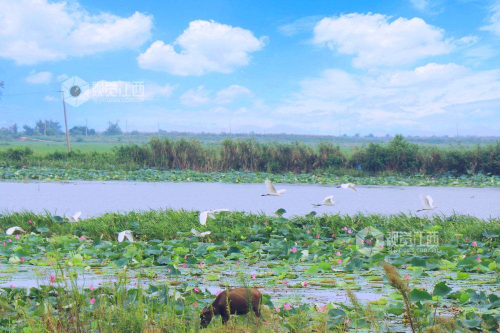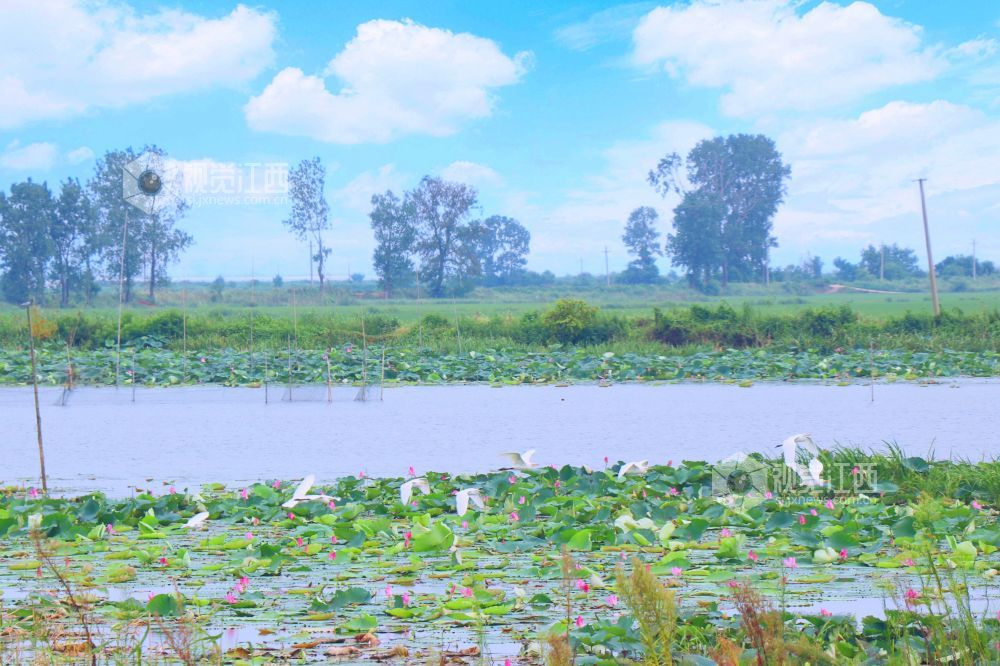 地处鄱阳湖东南岸余干县水生植物众多,良好的生态环境引来成群白鹭在水边、田间觅食嬉戏,呈现出一幅美丽和谐的生态画卷。