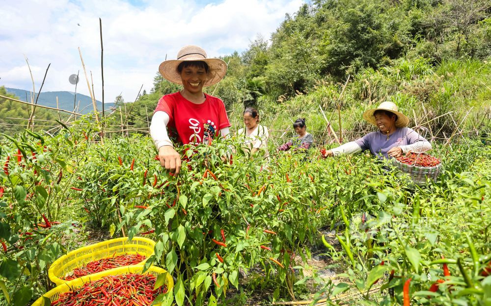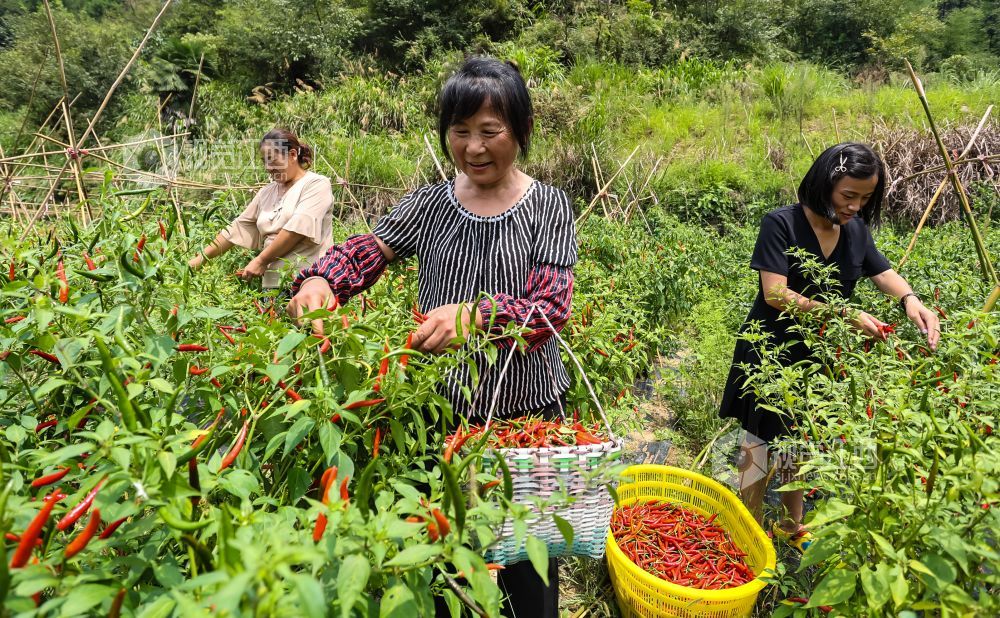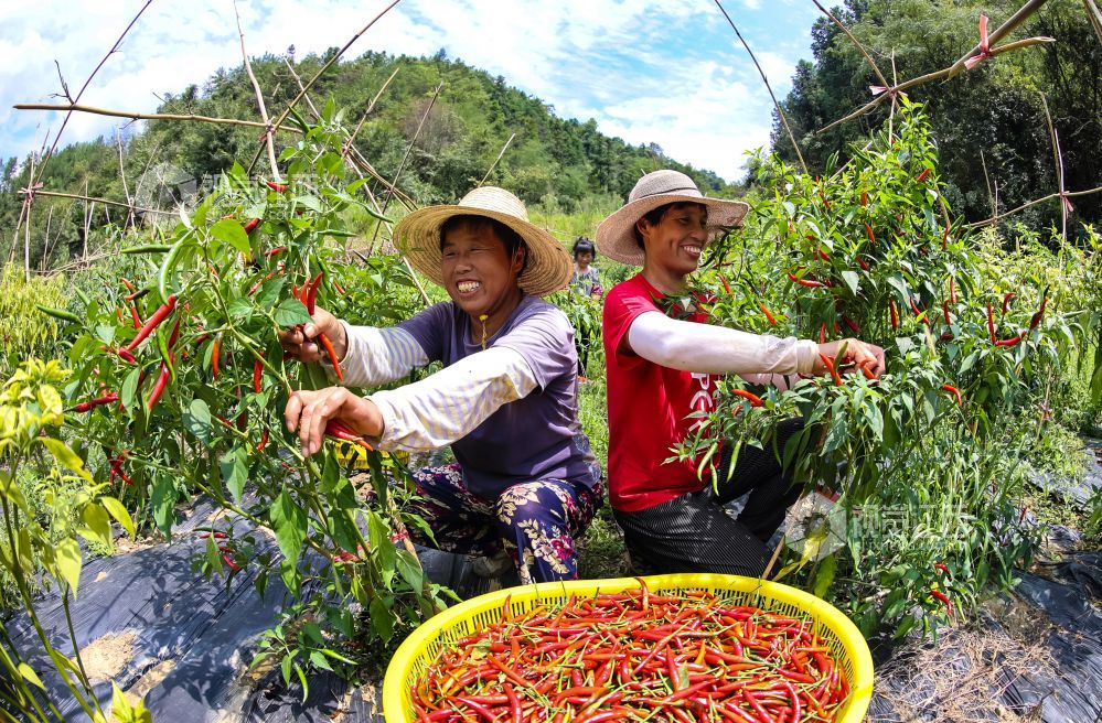2021年8月23日,江西省瑞昌市横港镇红星村小米椒种植基地,村民们在红绿相间的辣椒地里忙碌采摘。