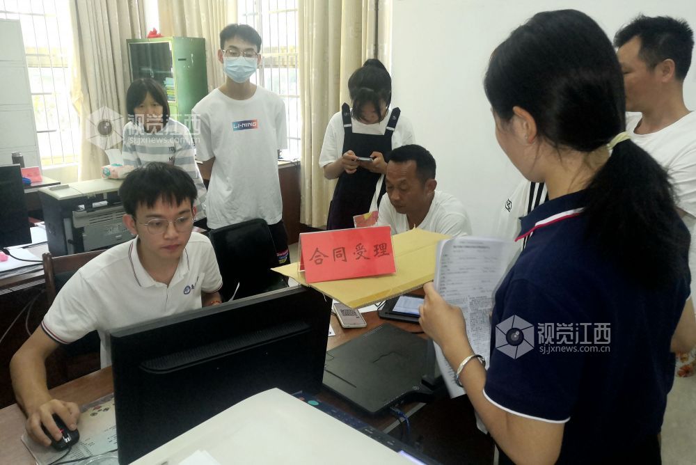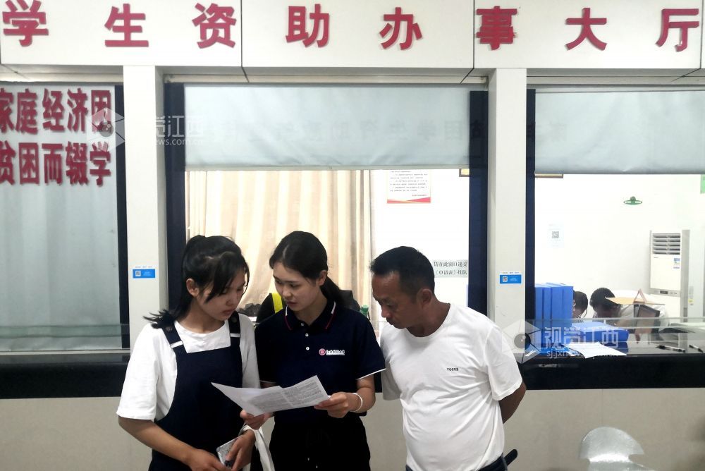 2021年8月25日,江西省抚州市南丰县学生资助管理中心的工作人员在向贫困学生及家长宣传助学贷款政策并为贫困学生办理生源地助学贷款。
