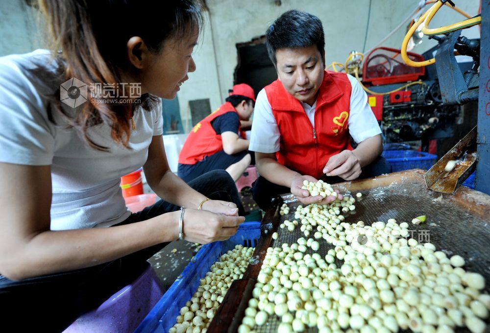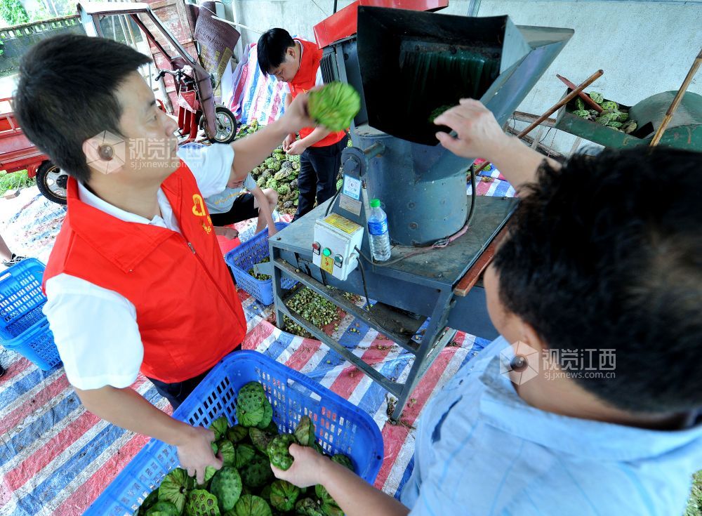 2021年8月21日,江西省德兴市李宅乡党员干部正在该乡宗儒村帮助莲农采摘莲蓬。