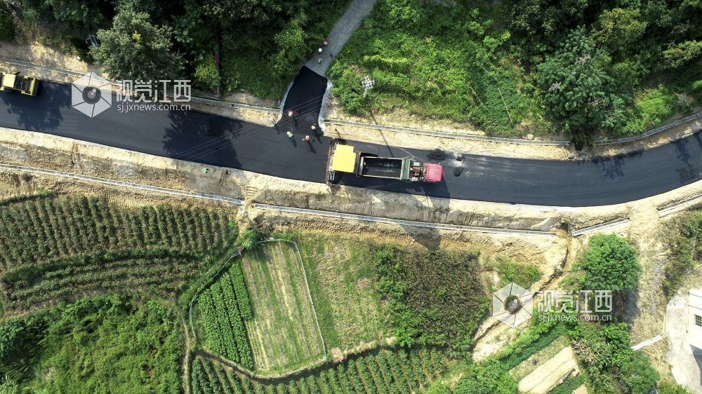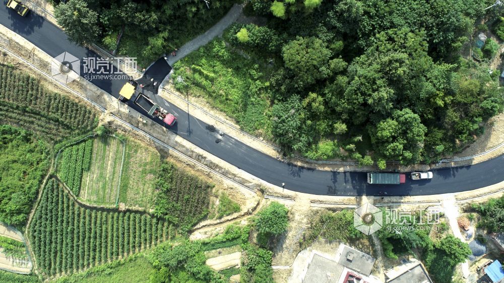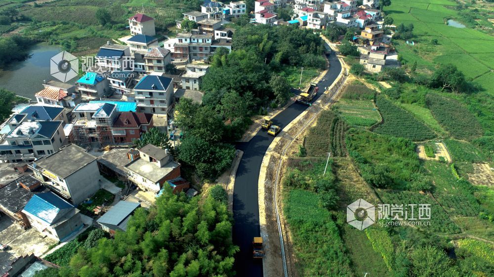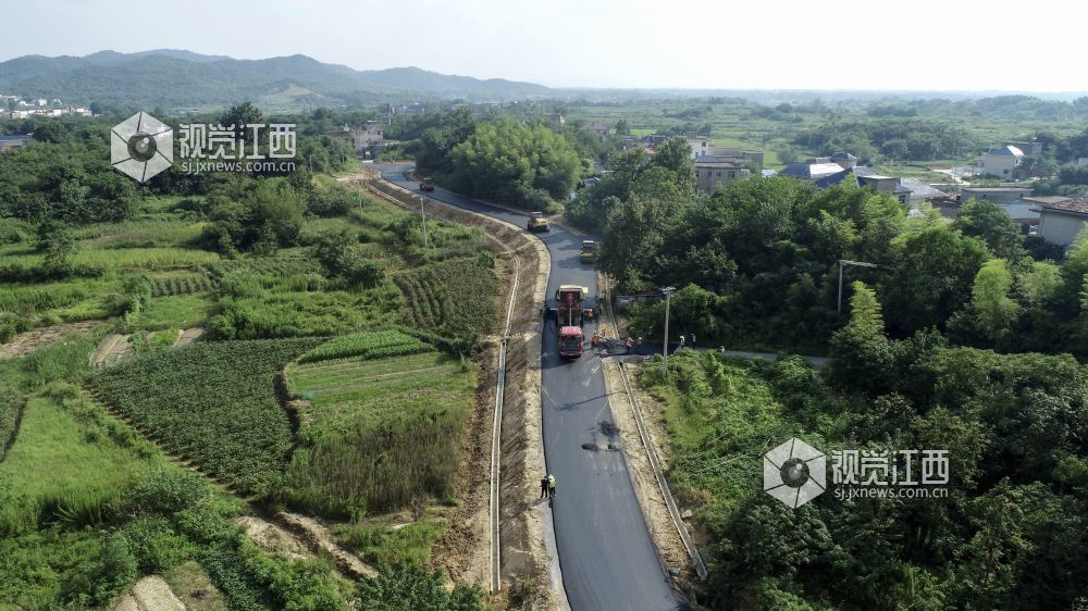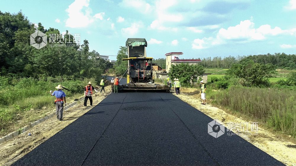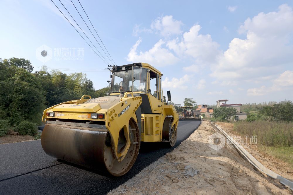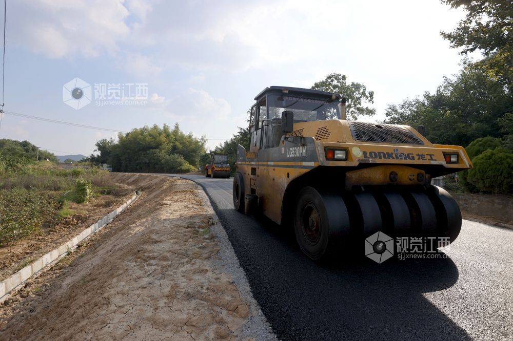 2021年9月1日,在江西省九江市湖口县高塘至均桥 “四好农村路”项目施工现场,运输车辆来往穿梭,摊铺机正在摊铺沥青,压路车来回压实路面,施工人员忙着将沥青均匀地填满道路各个角落,一派火热的建设景象。