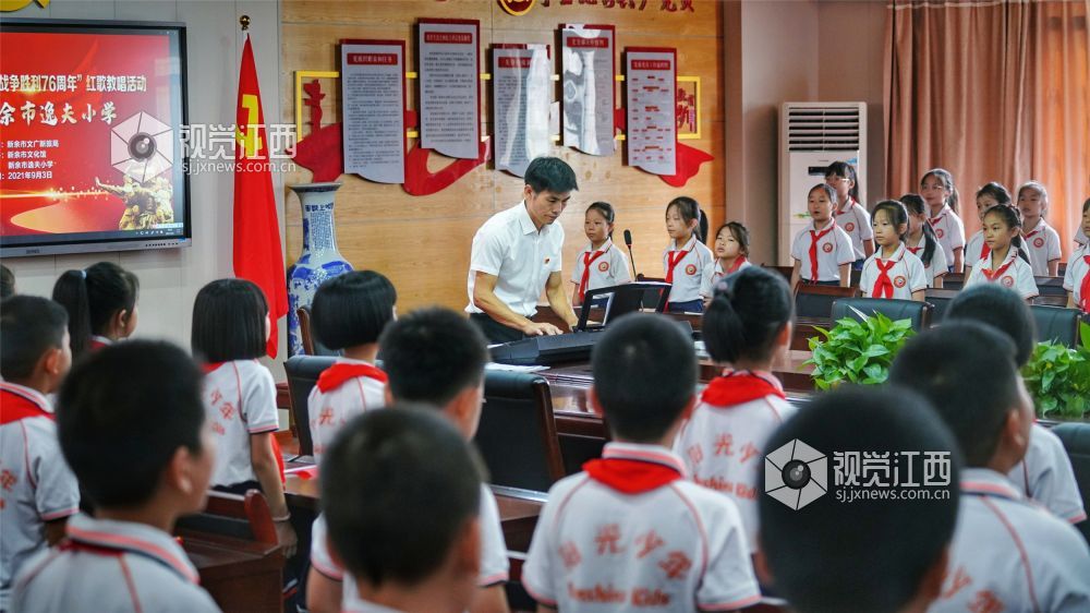 2021年9月3日,江西省新余市文化馆走进逸夫小学开展“抗战胜利76周年 · 红歌教唱”活动。教孩子们一起唱红歌,讲抗战小英雄的故事!