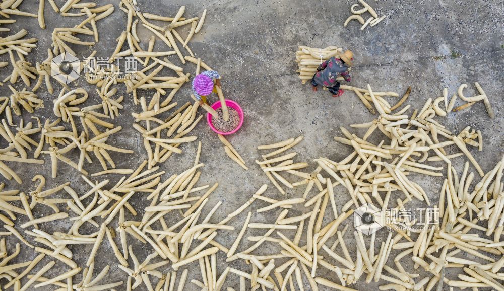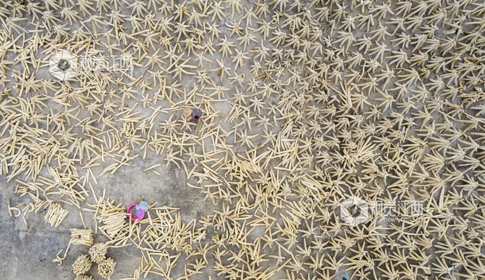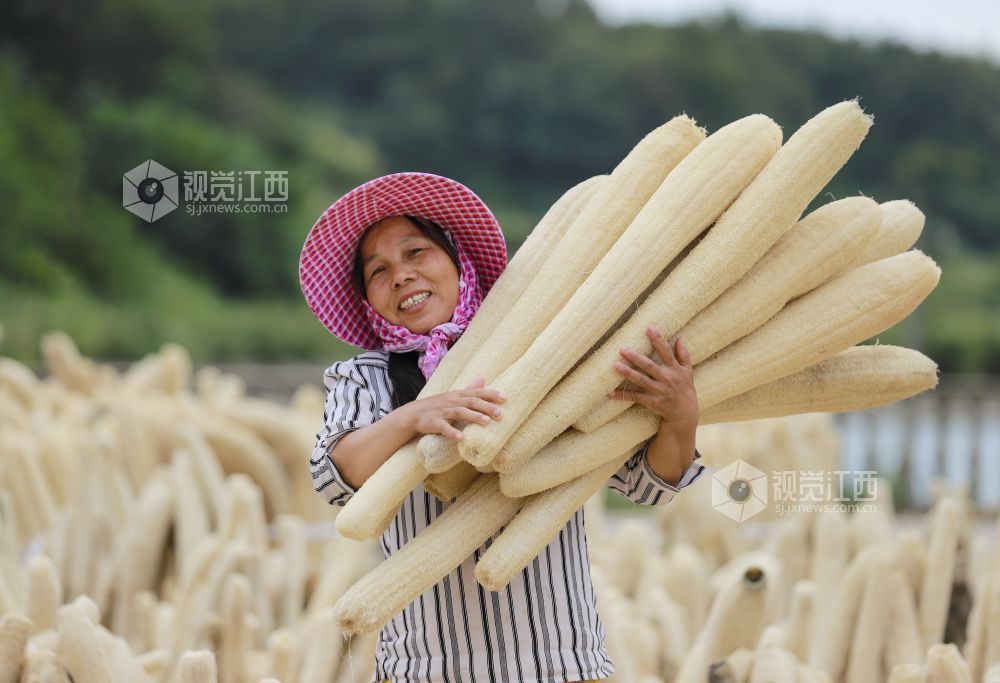 9月13日,江西省九江市湖口县付垅乡百余亩丝瓜络喜获丰收,农户正在晾晒第二茬丝瓜络。