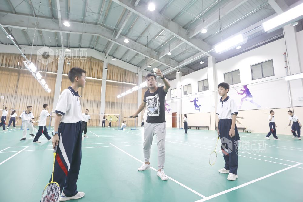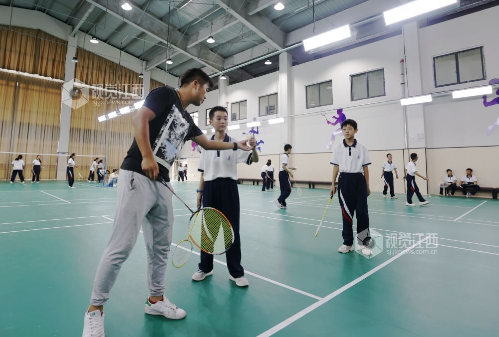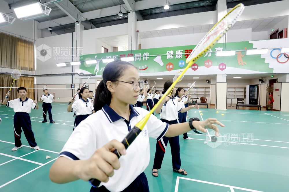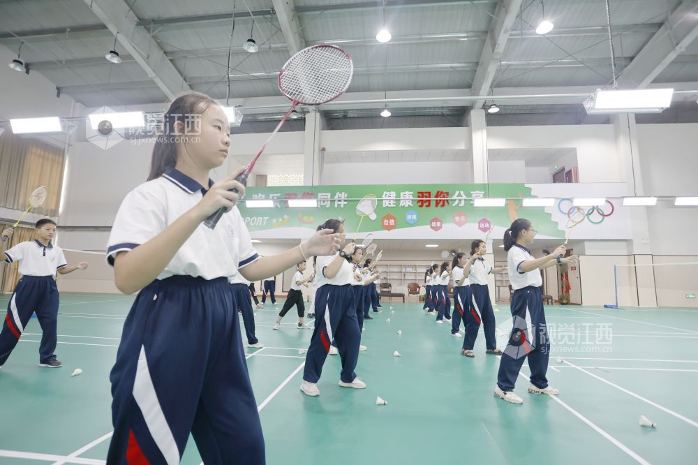 2021年9月13日,在江西省九江市湖口县第三中学羽毛球馆内,学生们正在进行架拍、上步击网前球、正手发高远球等羽毛球基本功训练。