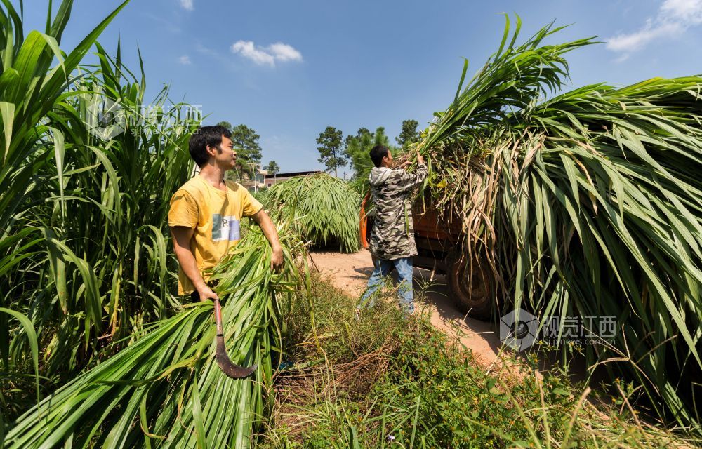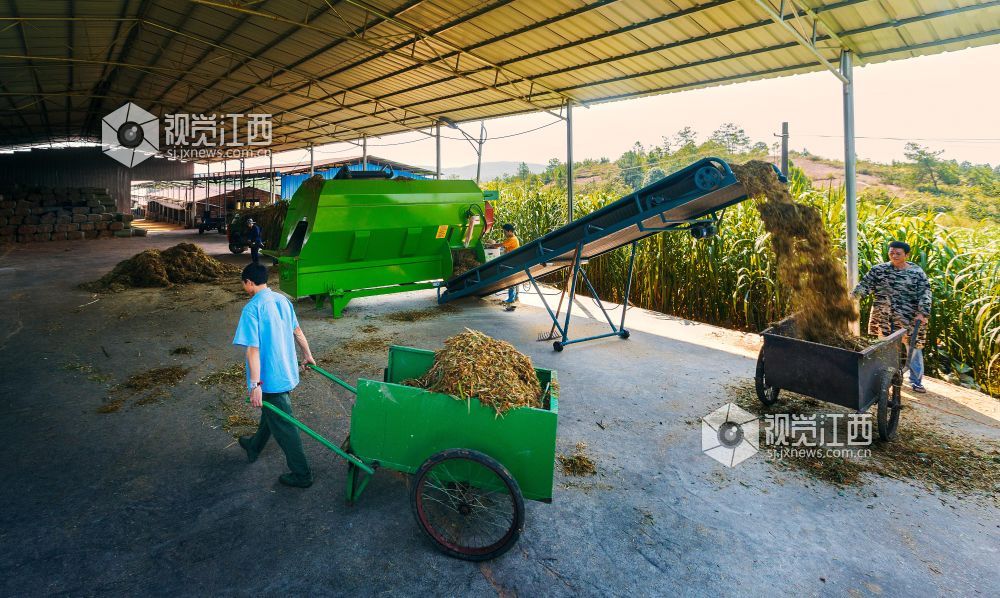 9月15日,在江西省永新县莲洲乡固塘村的肉牛养殖基地,不少村民正忙着收割、运输和加工牧草,田间地头、加工车间,一派繁忙的景象。