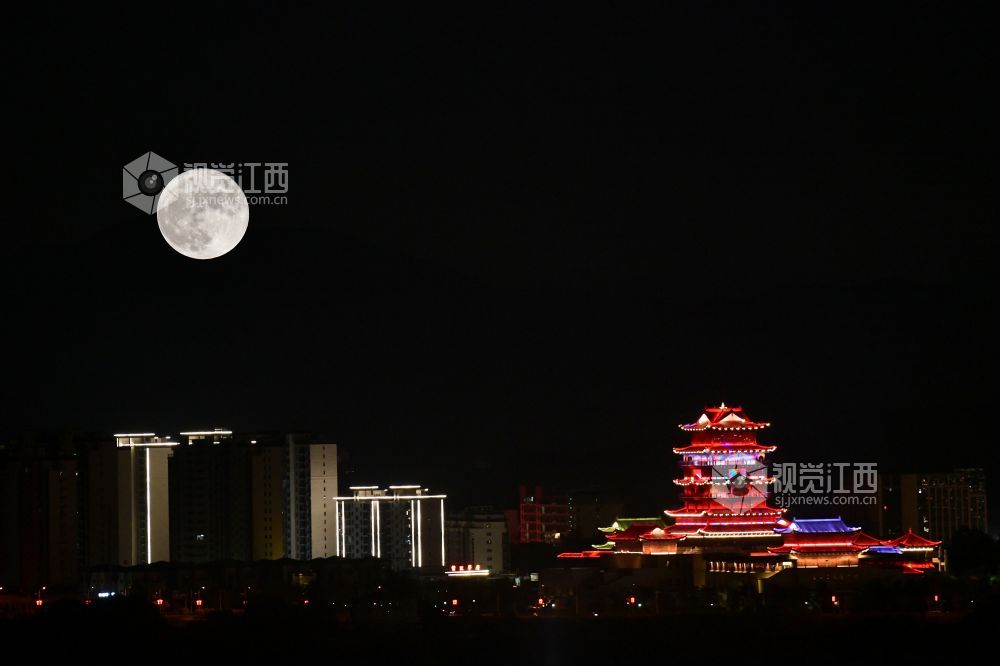 2021年9月21日,航拍江西省上饶市铅山县河口镇中秋月圆之夜,在城市上方皓月当空照。据天文学家介绍,从今年起至2023年中秋都是“十五的月亮十五圆”。