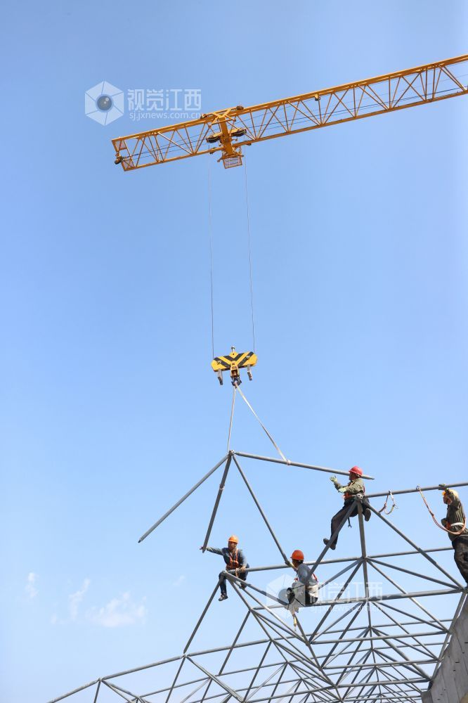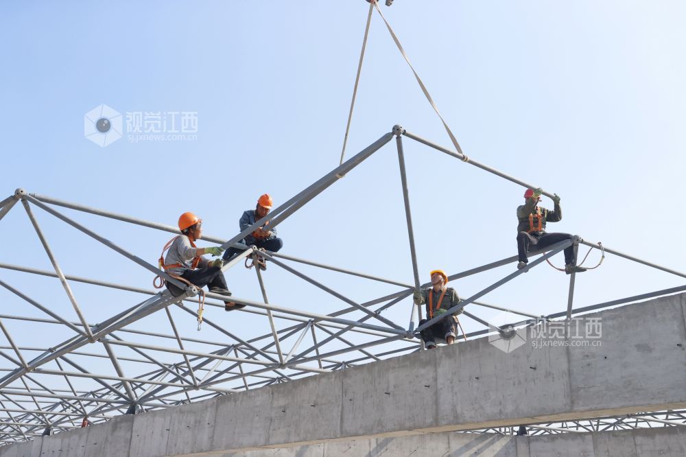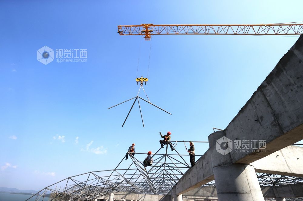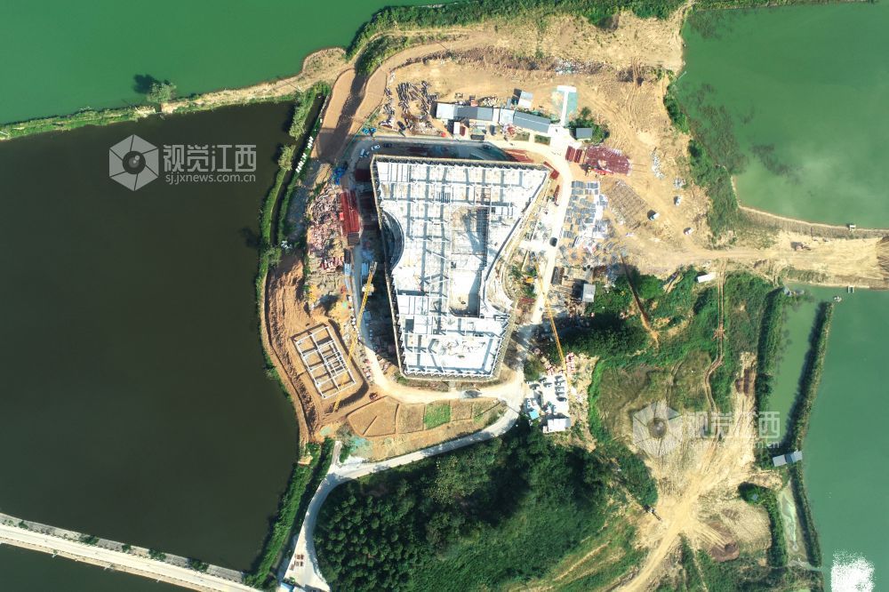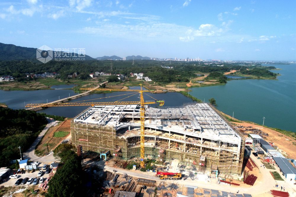 2021年9月23日,在江西省九江市湖口县南北港长江鄱阳湖水生物保护基地项目水生物保护展示馆施工现场,施工人员正在加紧施工。
