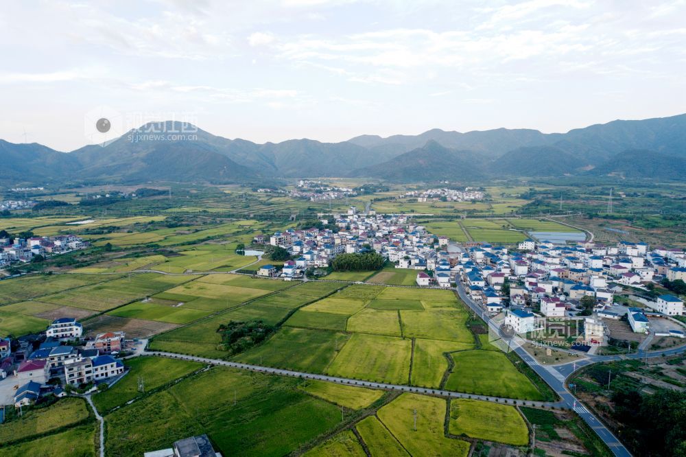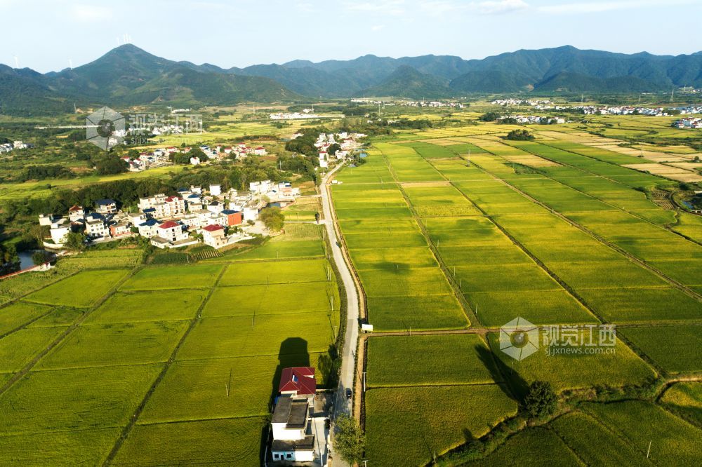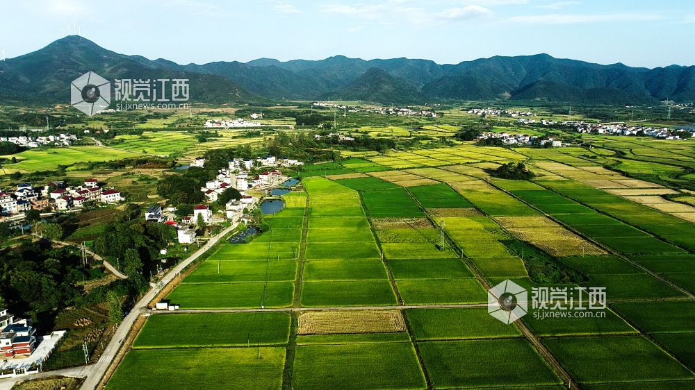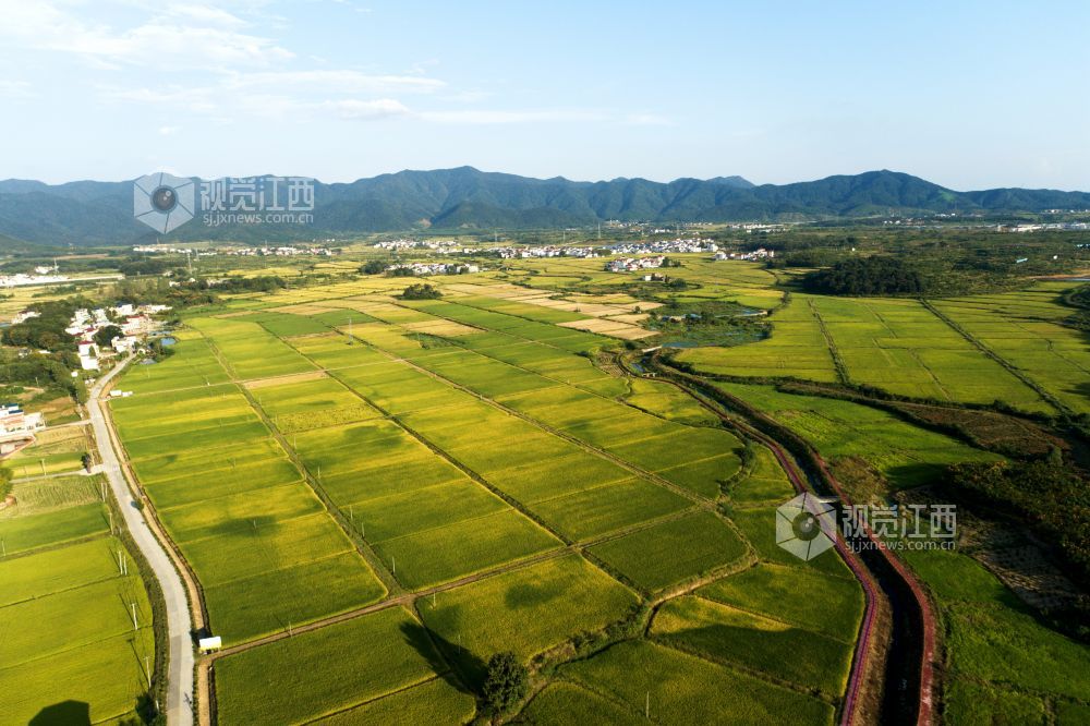 2021年9月24日,在江西省九江市湖口县武山镇万亩稻油轮作示范基地,金黄色的稻谷与阡陌交通、蜿蜒村庄相映成趣,把山村点缀得美丽如画。