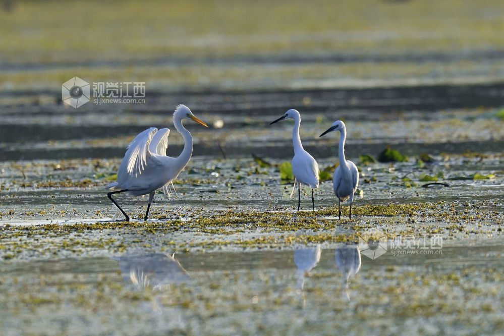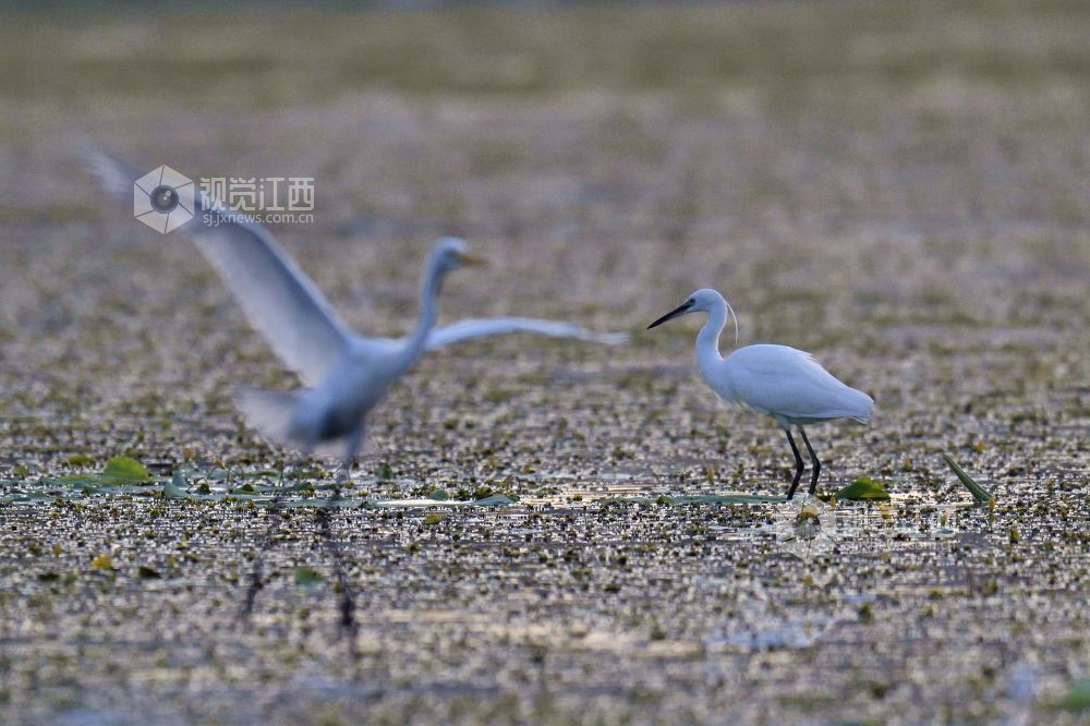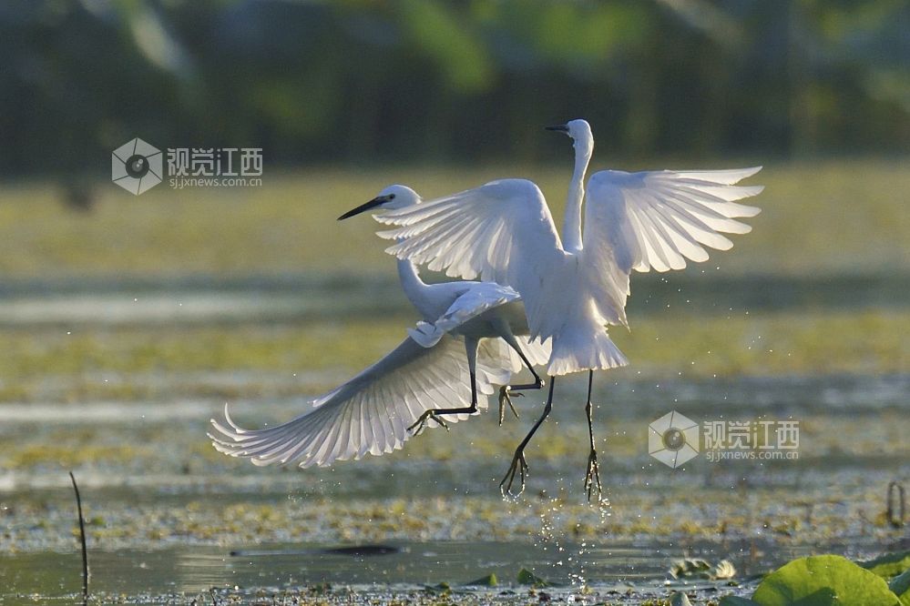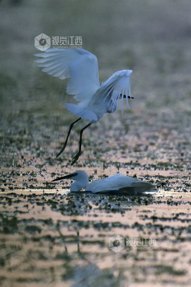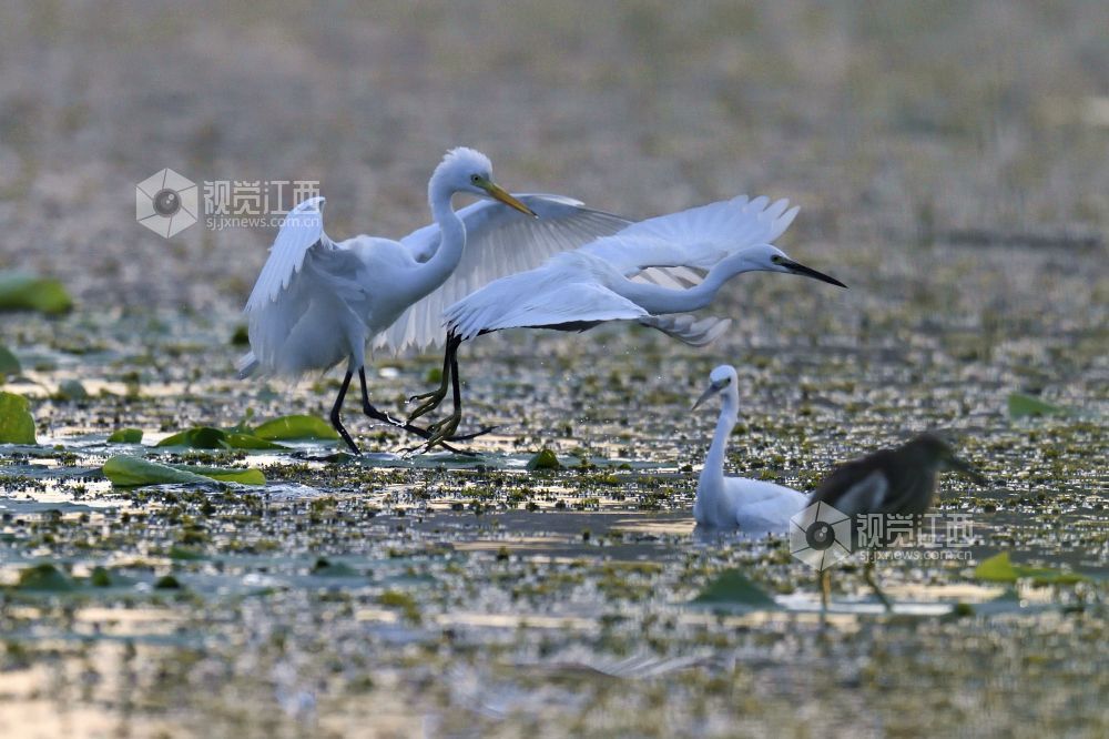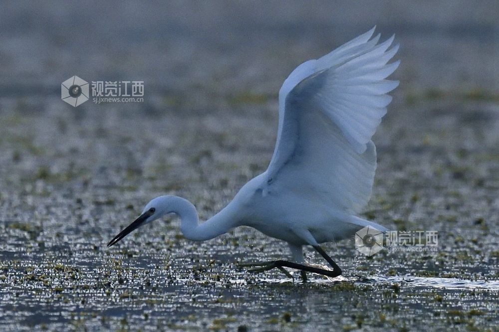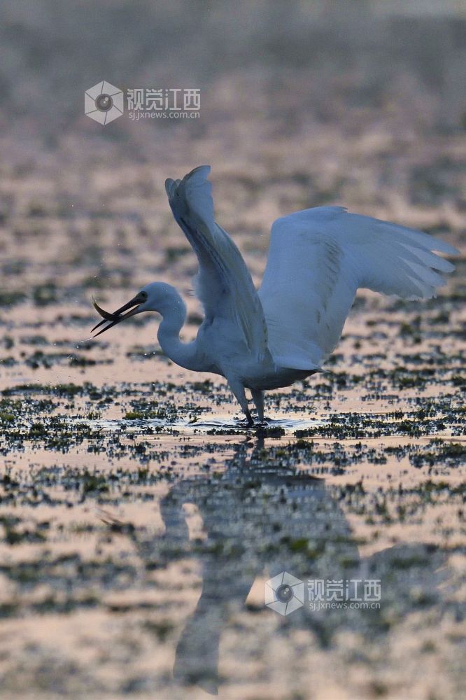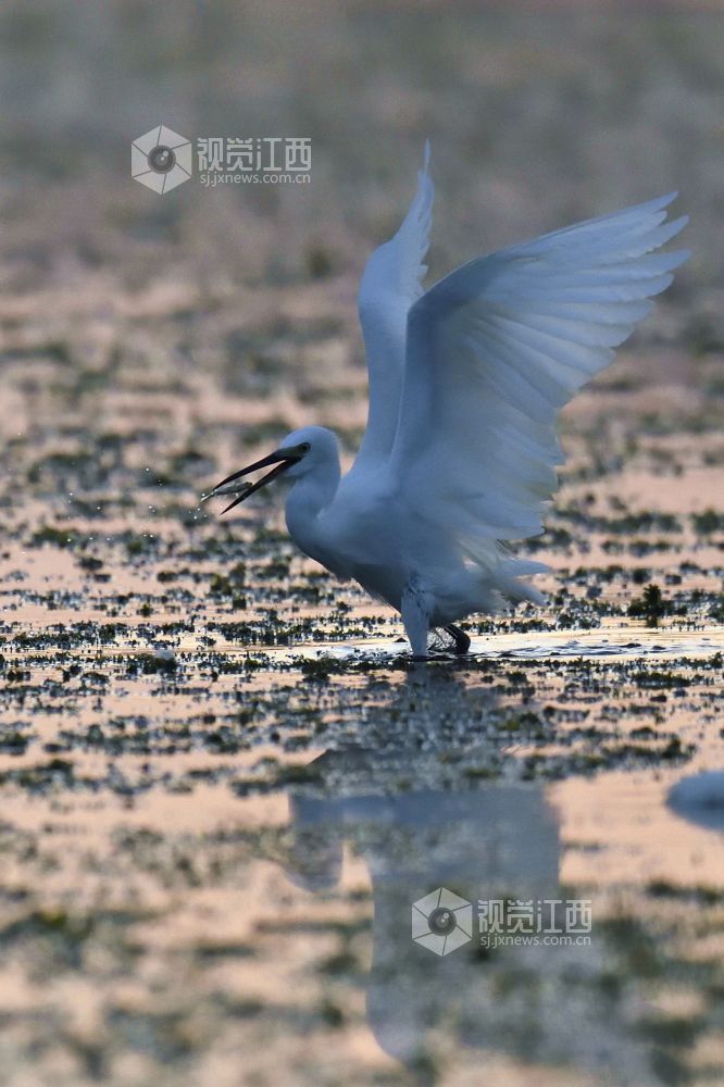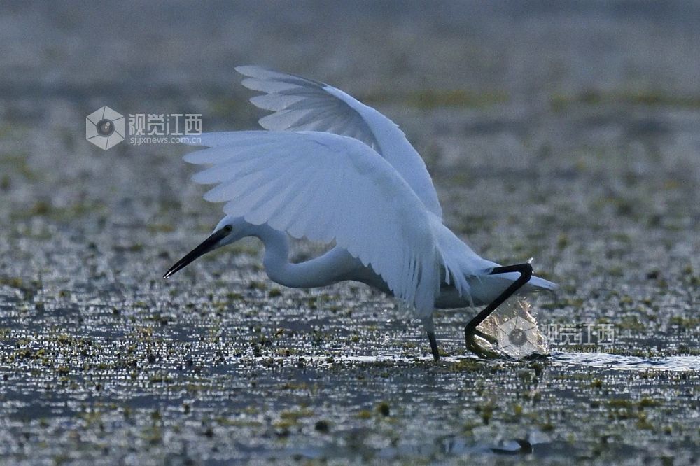 9月22日清晨,新开放的江西省南昌市鱼尾洲公园里白鹭在湿地欢快地觅食着。