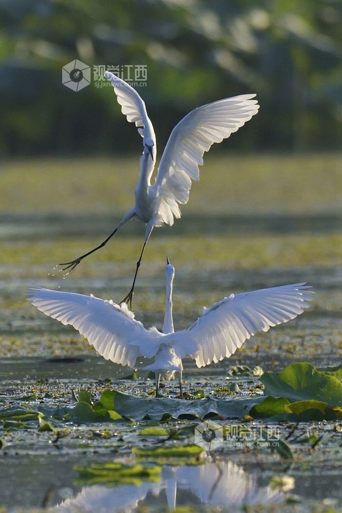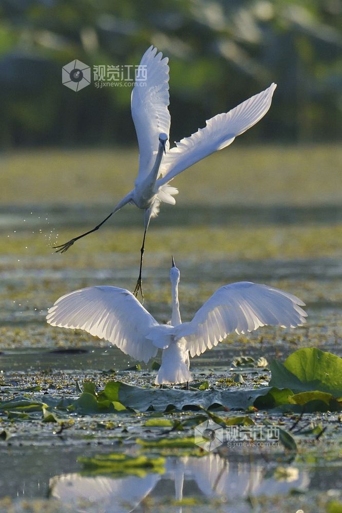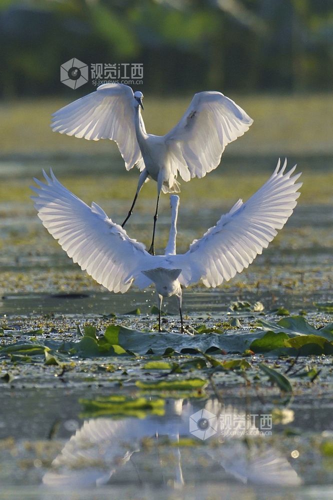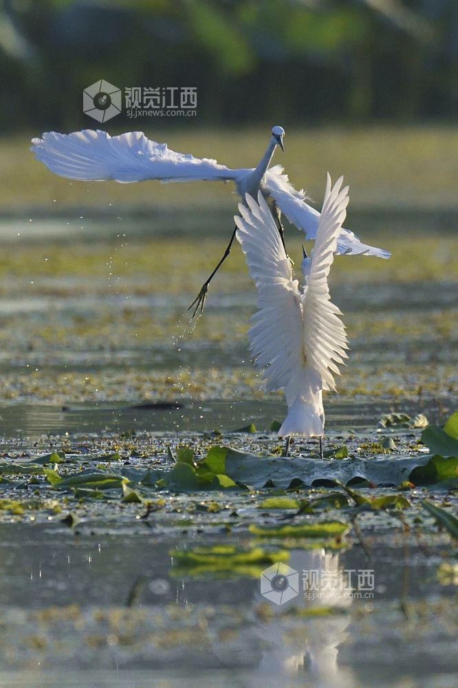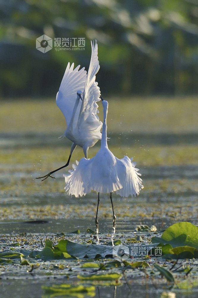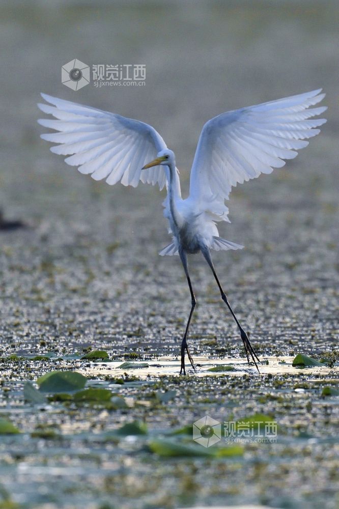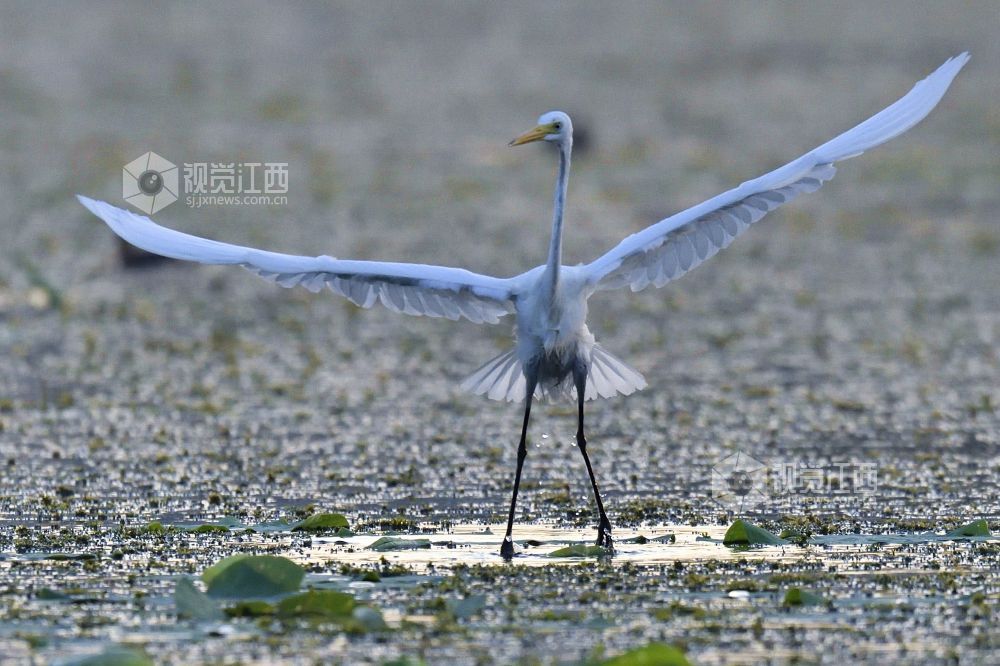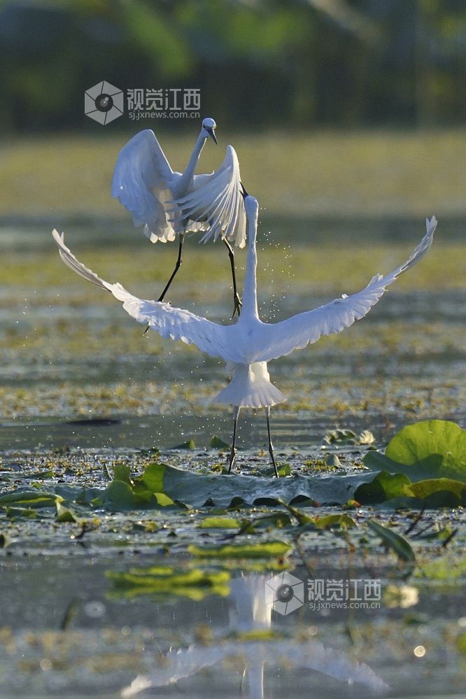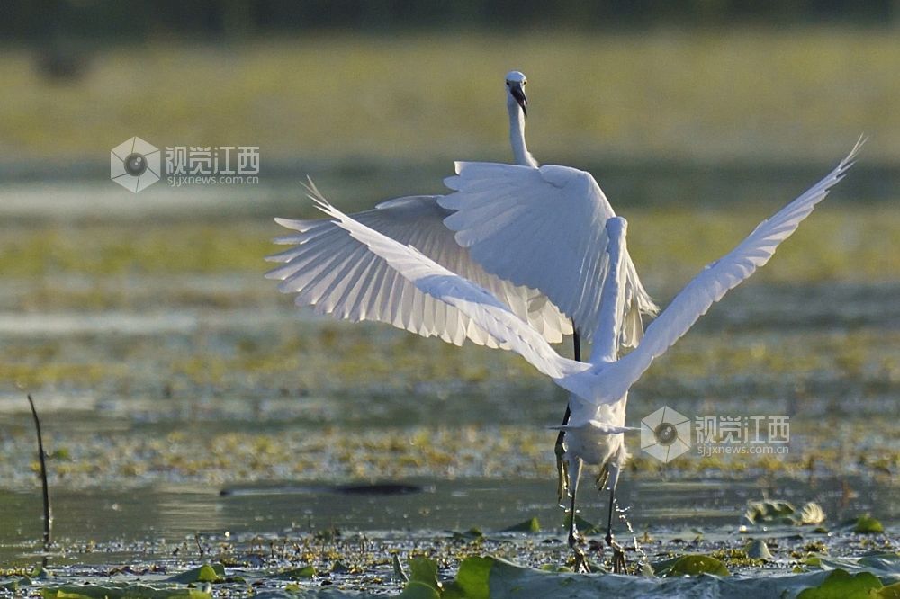 9月22日清晨,新开放的江西省南昌市鱼尾洲公园里白鹭在湿地欢快地觅食着。