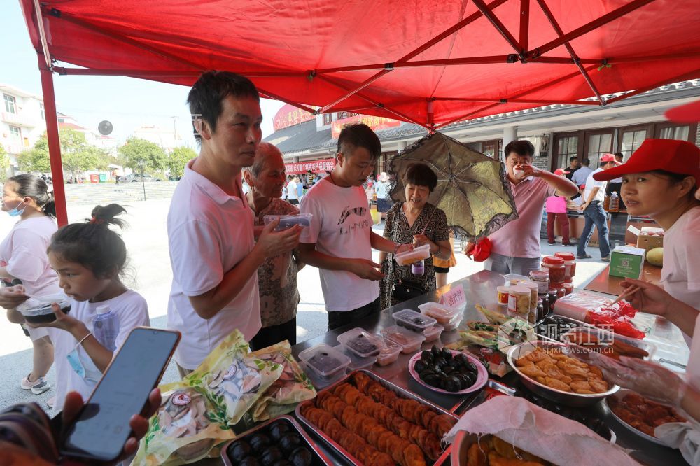 10月4日,游客在莲花县坊楼镇沿背村购买农副产品,品尝风味小吃。国庆假期期间,莲花县坊楼镇抓住游客众多的有利时机,举办“迎国庆.感党恩.庆丰收特色农产品促销会”推销本地农产品,吸引游客前来休闲旅游、购物打卡。
